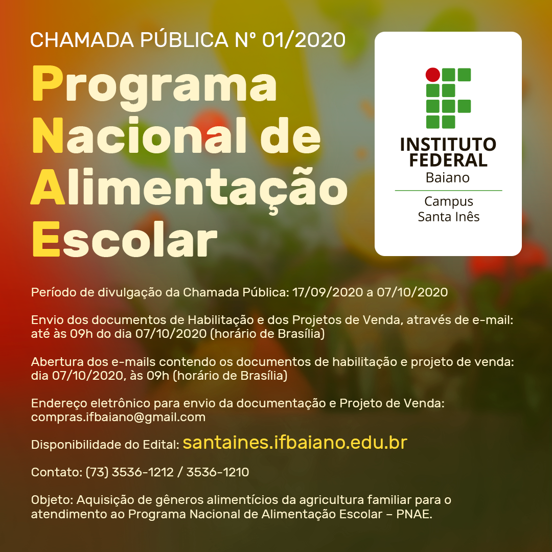 O IF Baiano Campus Santa Inês torna público para conhecimento dos interessados que fará chamada pública para formalização de dispensa de licitação para aquisição de gêneros alimentícios da agricultura familiar para o atendimento ao Programa Nacional de Alimentação Escolar – PNAE.