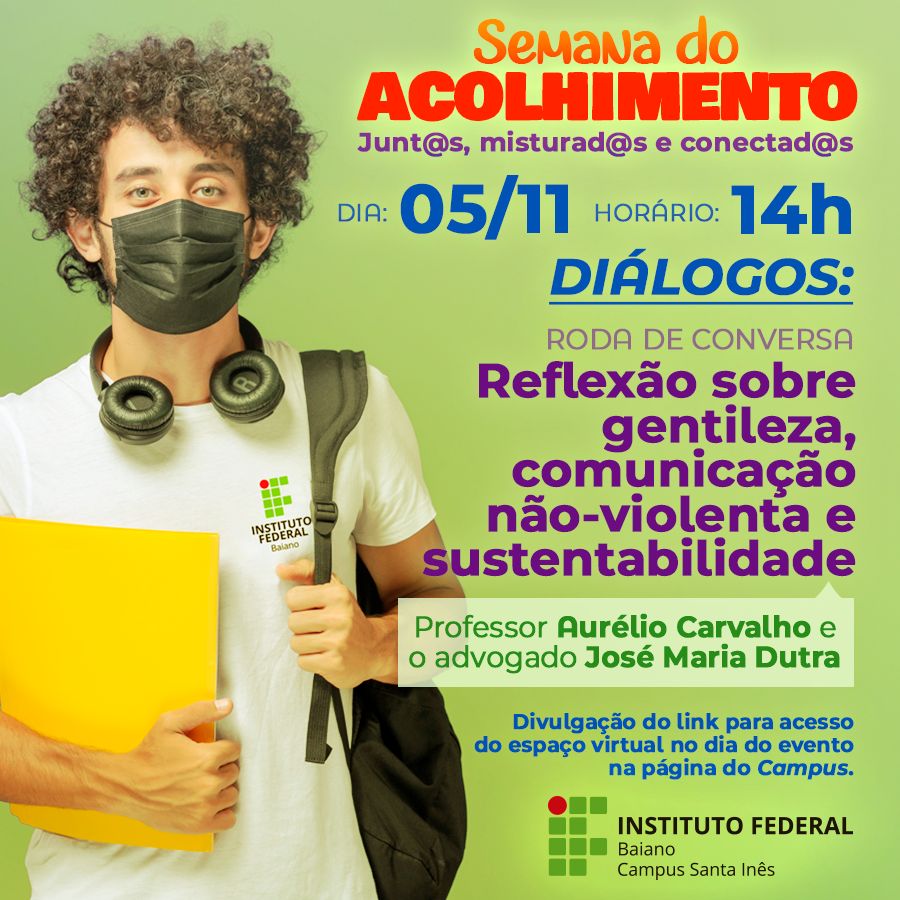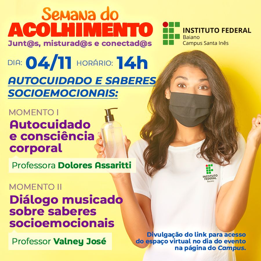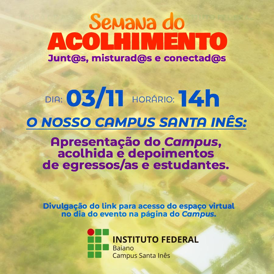 No período de 03 a 05/11 está programada a “Semana do Acolhimento”, totalmente online e com programação sempre no horário das 14h. Estão previstas na programação: Apresentação do Campus, acolhida, depoimentos de estudantes e egressos, palestras, diálogos e roda de conversa.