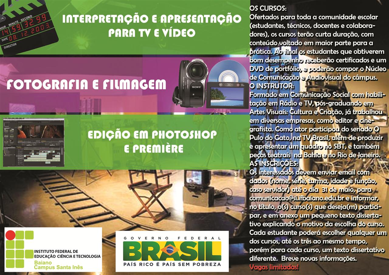 Os cursos de Interpretação, Filmagem e Edição serão ofertados para toda a comunidade escolar (estudantes, técnicos, docentes e colaboradores), e terão curta duração, com conteúdo voltado em maior parte para a prática. Ao final, os estudantes que obtiverem bom desempenho receberão certificados e um DVD de portfólio, e poderão compor o Núcleo de Comunicação e Audiovisual do câmpus.