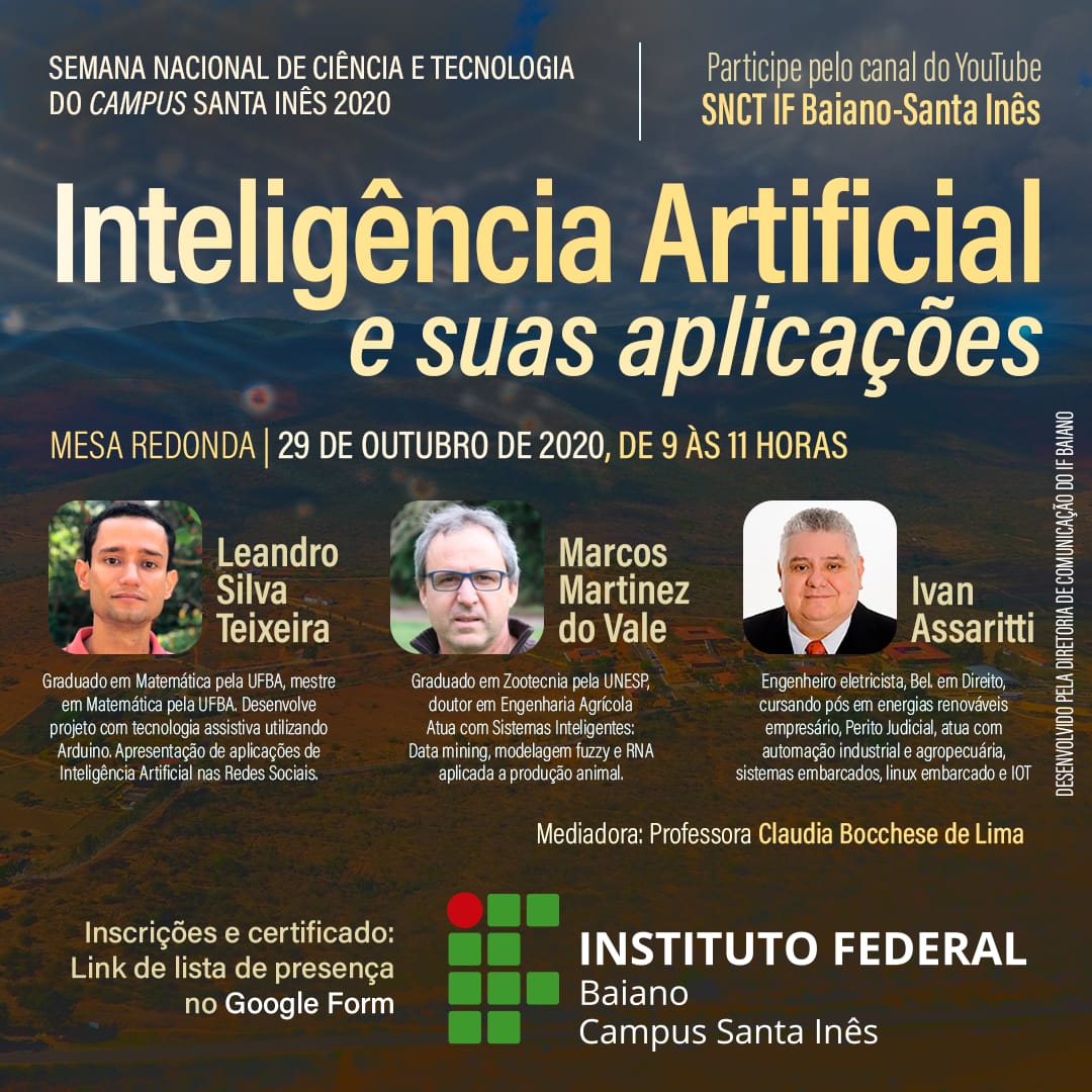 O evento “Mesa Redonda sobre Inteligência Artificial e suas aplicações” está programado para acontecer das 09h às 11h, de forma on-line e será transmitido através do Canal do youtube SNCT IF Baiano-Santa Inês: