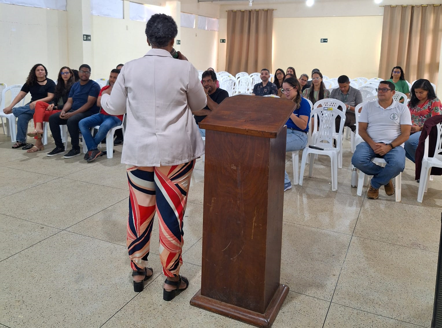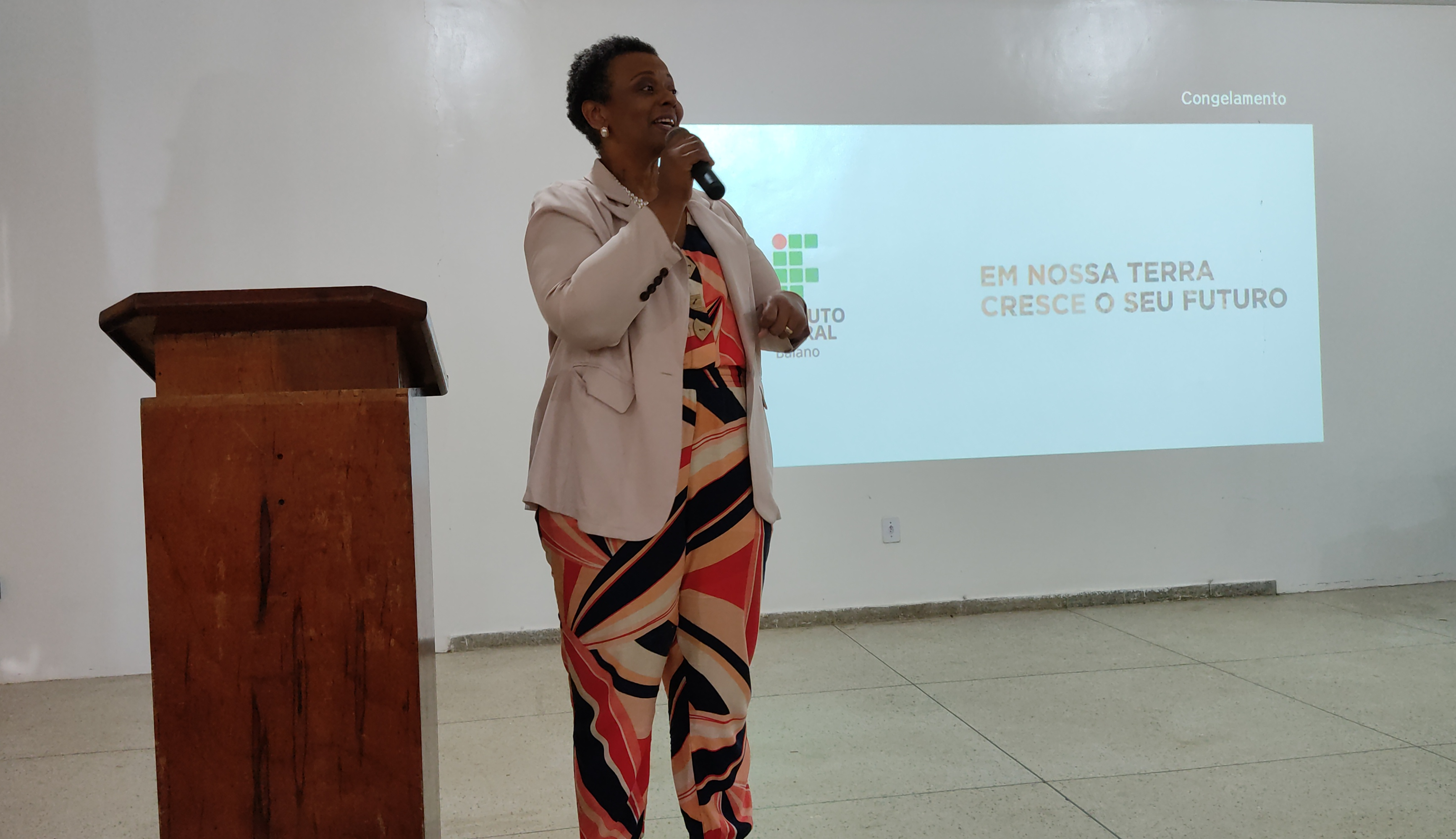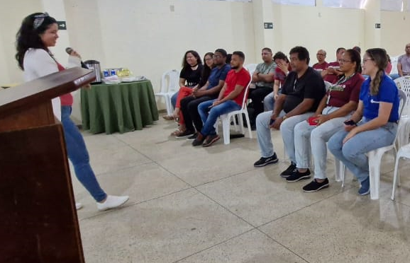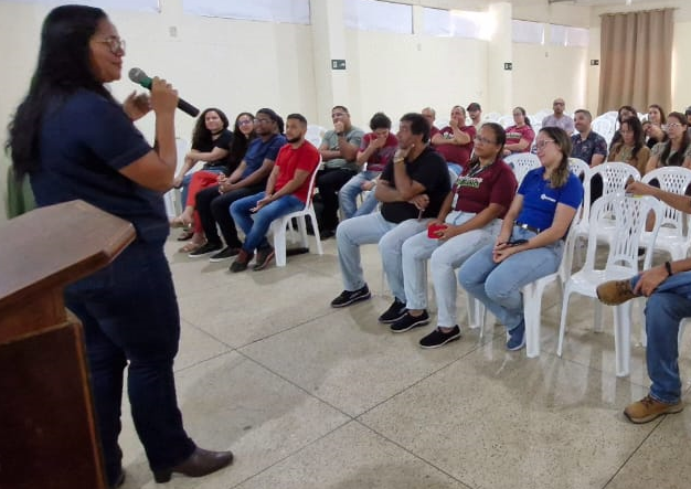Rosana Santos, do Núcleo de Gestão de Pessoas, iniciou a acolhida desejando as boas-vindas aos novos servidores e falou sobre o desejo expressado pela gestão, na pessoa da professora Genilda Lima, da necessidade de fazer o acolhimento, de forma coletiva, dos servidores ingressantes e, em seguida, convidou a Diretora-geral para dar início ao encontro.