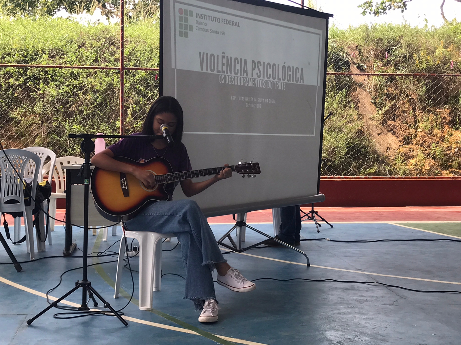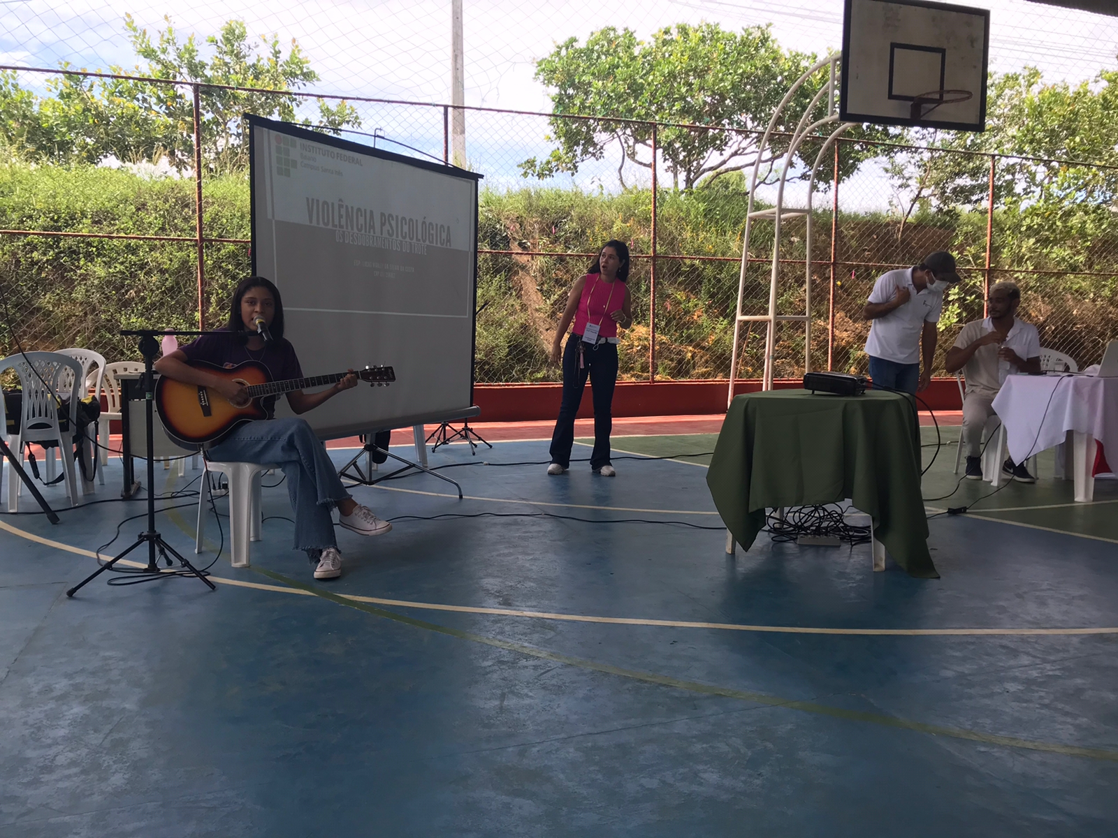 Após uma breve fala de boas vindas pela equipe gestora do Campus, os presentes foram recepcionados com uma apresentação musical (voz e violão) da estudante Bruna Carla do Curso Técnico em Alimentos.