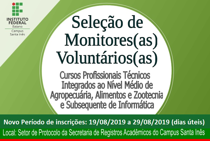 O Diretor-Geral do IF Baiano Campus Santa Inês torna público o Edital de Seleção de Monitores/as Voluntários/as para os Cursos Técnicos Integrados ao Ensino Médio do IF Baiano Campus Santa Inês.
