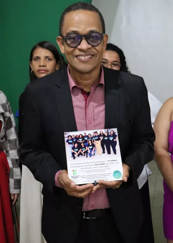 O Professor Fred Julião, com sua formação em Medicina Veterinária, iniciou o evento com um emocionante pronunciamento. Em suas palavras, ele agradeceu profundamente aos alunos por terem “tornado ele um professor”, reconhecendo o papel fundamental que cada estudante teve em sua jornada. Fred Julião destacou as inúmeras conquistas alcançadas junto aos seus pupilos, incluindo participações em congressos, publicações de artigos, capítulos de livros e até mesmo livros inteiros. A gratidão se estendeu às diversas escolas que, ao longo dos anos, mantiveram suas portas abertas para a Mostra Parasitológica, uma atividade extensionista que se tornou um pilar na comunidade. O IF Baiano também foi calorosamente agradecido pelo apoio incondicional ao projeto desde sua primeira edição.