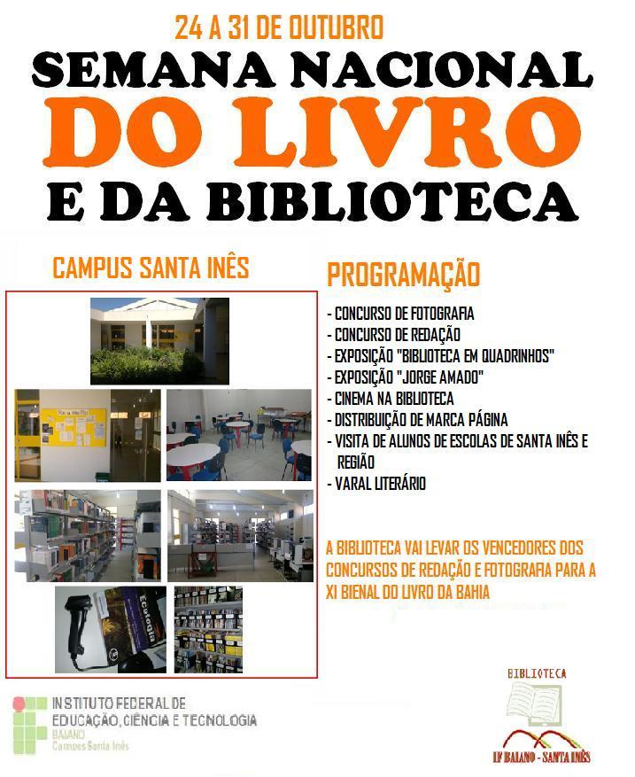 Entre os dias 24 e 31 de outubro a Biblioteca do campus Santa Inês realizará diversas atividades em comemoração a Semana Nacional do Livro e da Biblioteca.