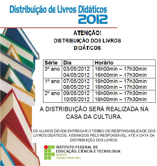 Já está disponível o calendário para a distribuição dos livros didáticos. A distribuição será realizada na CASA DE CULTURA. Os alunos deverão entregar o termo de responsabilidade, assinado pelo responsável, até a data de distribuição dos livros.