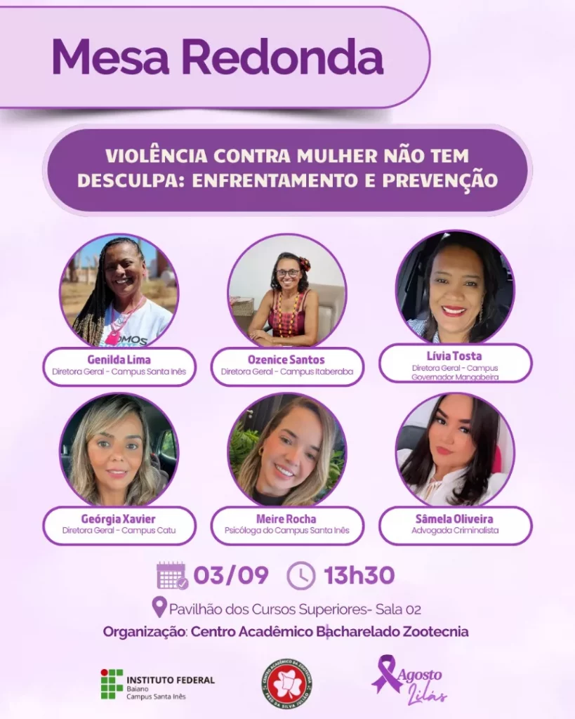 Em mais uma demonstração de protagonismo estudantil, o Centro Acadêmico do Bacharelado em Zootecnia, em parceria com o Centro Acadêmico da Licenciatura em Geografia e a Associação Atlética Acadêmica Boss Taurus, realizará no próximo dia 03 de setembro uma roda de conversa com o tema “Violência Contra a Mulher não tem desculpa: Enfrentamento e Prevenção”. A ação, que conta com o apoio institucional do IF Baiano – Campus Santa Inês, integra a campanha “Agosto Lilás” e reforça o compromisso da comunidade acadêmica com a promoção dos direitos das mulheres. O encontro acontecerá às 13h30, na sala 2 do pavilhão dos cursos superiores.