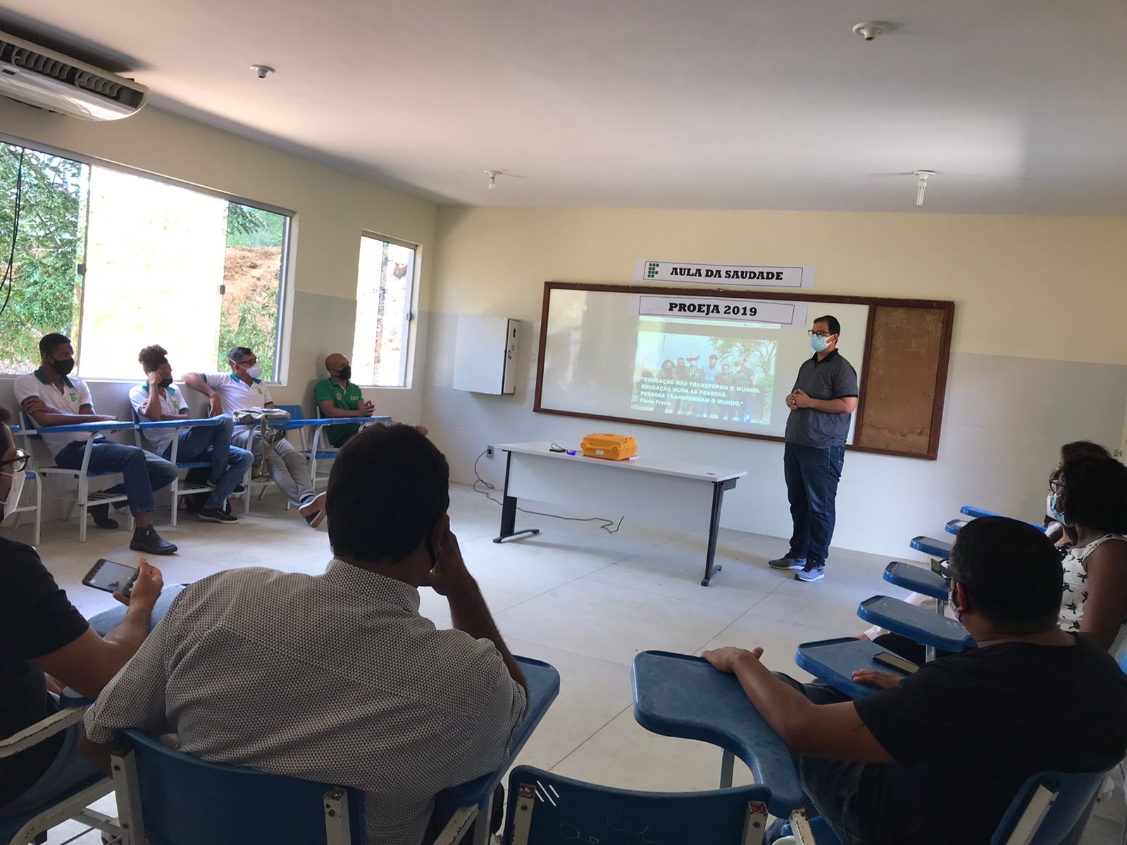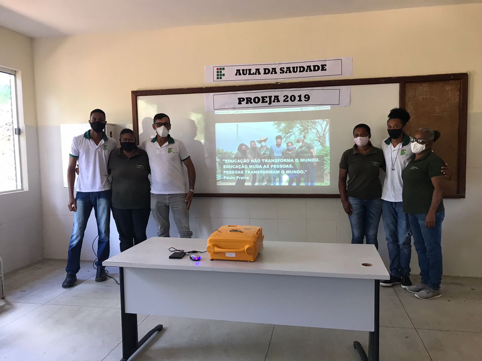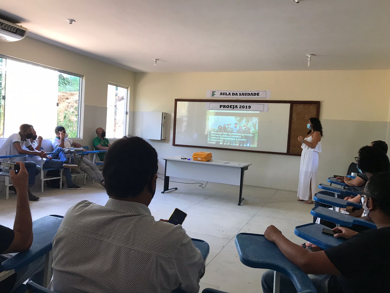 Para comemorar a conclusão da turma 2019 do curso Técnico Integrado em Agropecuária, modalidade Proeja, na metodologia da alternância, o Campus Santa Inês realizou hoje (12), às 11h, a aula da saudade, em uma das salas de aula do pavilhão de Agropecuária. Estavam presentes no evento, além dos seis Concluintes do curso, o Diretor Geral, professor Abdon Nogueira, a Diretora Acadêmica, Professora Daniele Matos, a Coordenadora de Ensino, Professora Genilda Lima, a Coordenadora do Curso, professora Patrícia Moura, o Coordenador Geral de Acompanhamento ao Educando, Ângelo Francisco Andrade, alguns servidores técnico-administrativos e professores do curso.