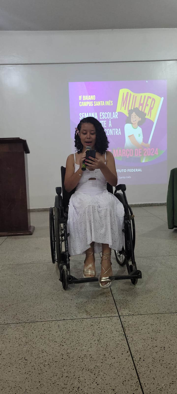 A professora Genilda Lima, Diretora do Campus Santa Inês, parabenizou os(as) organizadores(as) do evento e todas as mulheres, falou sobre as lutas, os desafios, as superações e as conquistas das mulheres ao longo dos anos e chamou todos a refletir sobre as conquistas “Estar como diretora e primeira diretora [mulher] dessa instituição, é sim uma luta, é sim uma conquista… e a gente precisa correr atrás de alcançar e conquistar muito mais”.