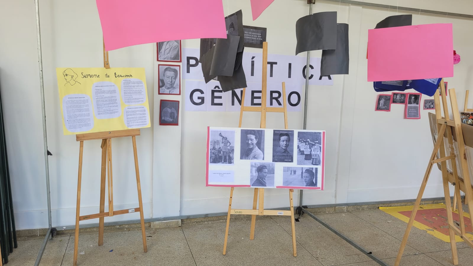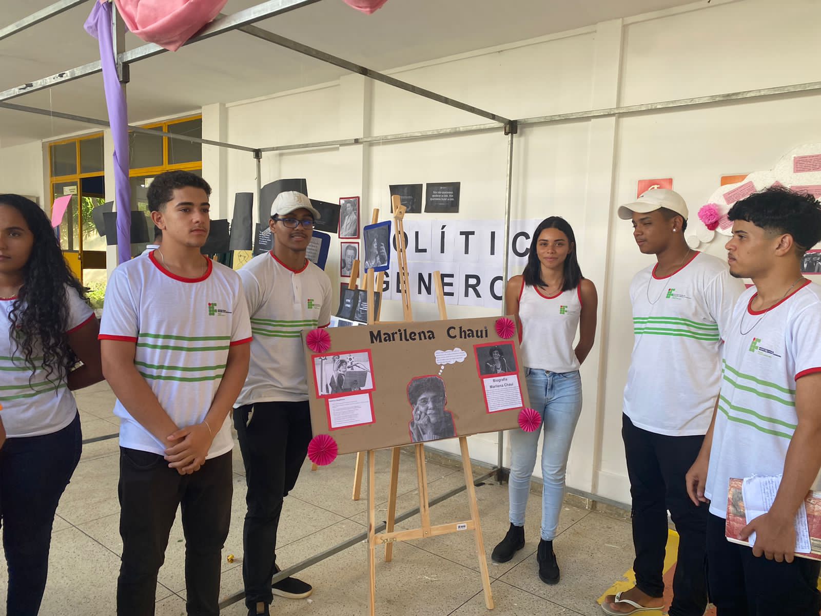 Estudantes apresentaram as contribuições das filósofas Olimpe de Gouges, Rosa Luxemburgo, Simone de Beauvoir, Ângela Davis e Marilena Chauí, para a construção de uma sociedade livre do machismo, misoginia, violência e desigualdade de gênero. A professora Cátia também orientou estudantes da 3ª série F, do Curso Técnico em Alimentos, sobre violência política de gênero, como ocorre essa violência e mecanismos para superação.
