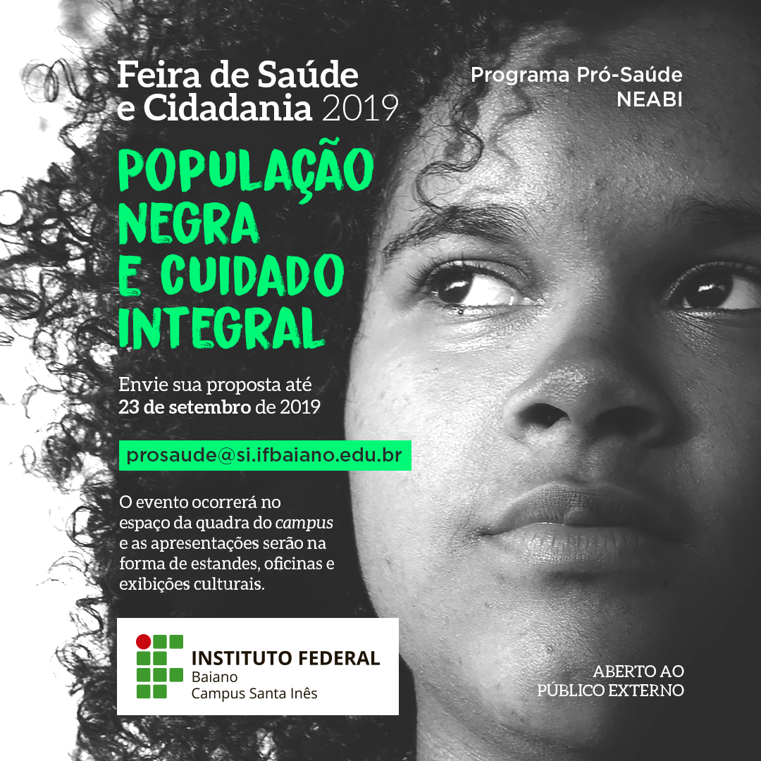 Todos podem participar (comunidade interna e externa). O Tema deste ano é População Negra e Cuidado Integral. As propostas deverão ser enviadas para o e-mail prosaude@si.ifbaiano.edu.br até o dia 23 de setembro e serão priorizadas de acordo com a viabilidade e o nível de interatividade apresentado.
