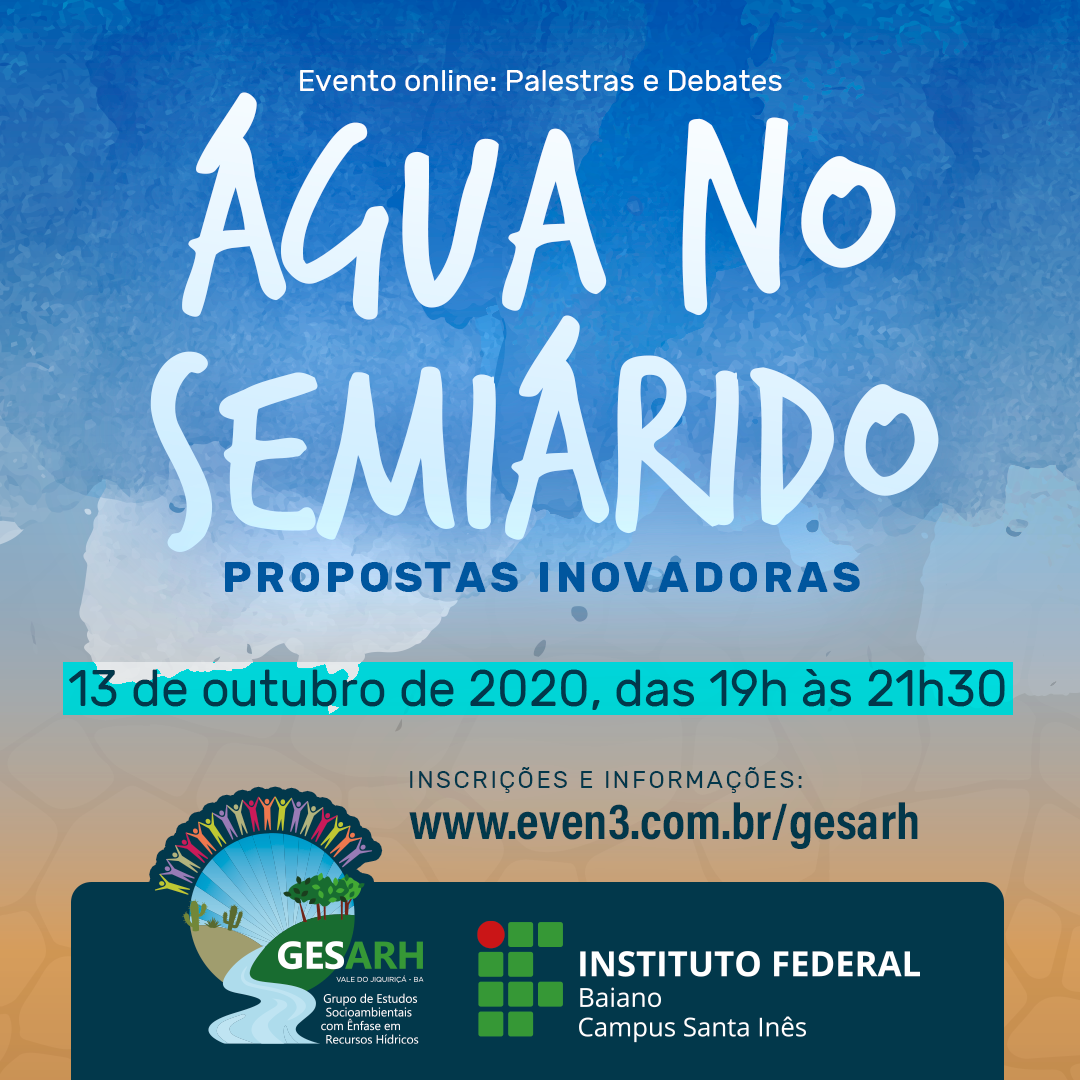No próximo dia 13 de (terça-feira), às 19h, acontece, de forma on-line, uma “mesa redonda” organizada pelo Grupo de Estudos Socioambientais com Ênfase em Recursos Hídricos (GESARH) do IF Baiano Campus Santa Inês. O evento, com participação de convidados, discutirá o tema: “Água no Semiárido: propostas inovadoras”.