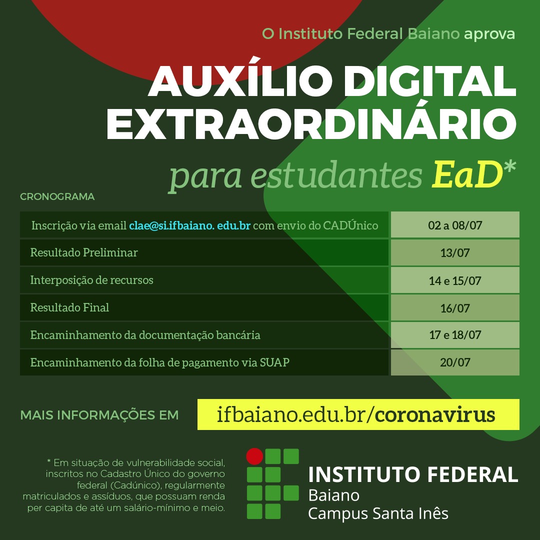 Diante dos impactos sociais provocados pela pandemia do novo coronavírus, o Conselho Superior do IF Baiano (Consup) aprovou a criação e regulamentação de um auxílio para os alunos de Educação a Distância (EAD), conforme Resolução 71/2020 de 23 de junho de 2020. Serão beneficiados pelo Auxílio Digital Extraordinário alunos em situação de vulnerabilidade social, inscritos no Cadastro Único do governo federal (Cadúnico), regularmente matriculados e assíduos, que possuam renda per capita de até um salário-mínimo e meio, conforme definido pelo Decreto 7.234, de 19 de julho de 2010, que dispõe sobre o Programa Nacional de Assistência Estudantil.