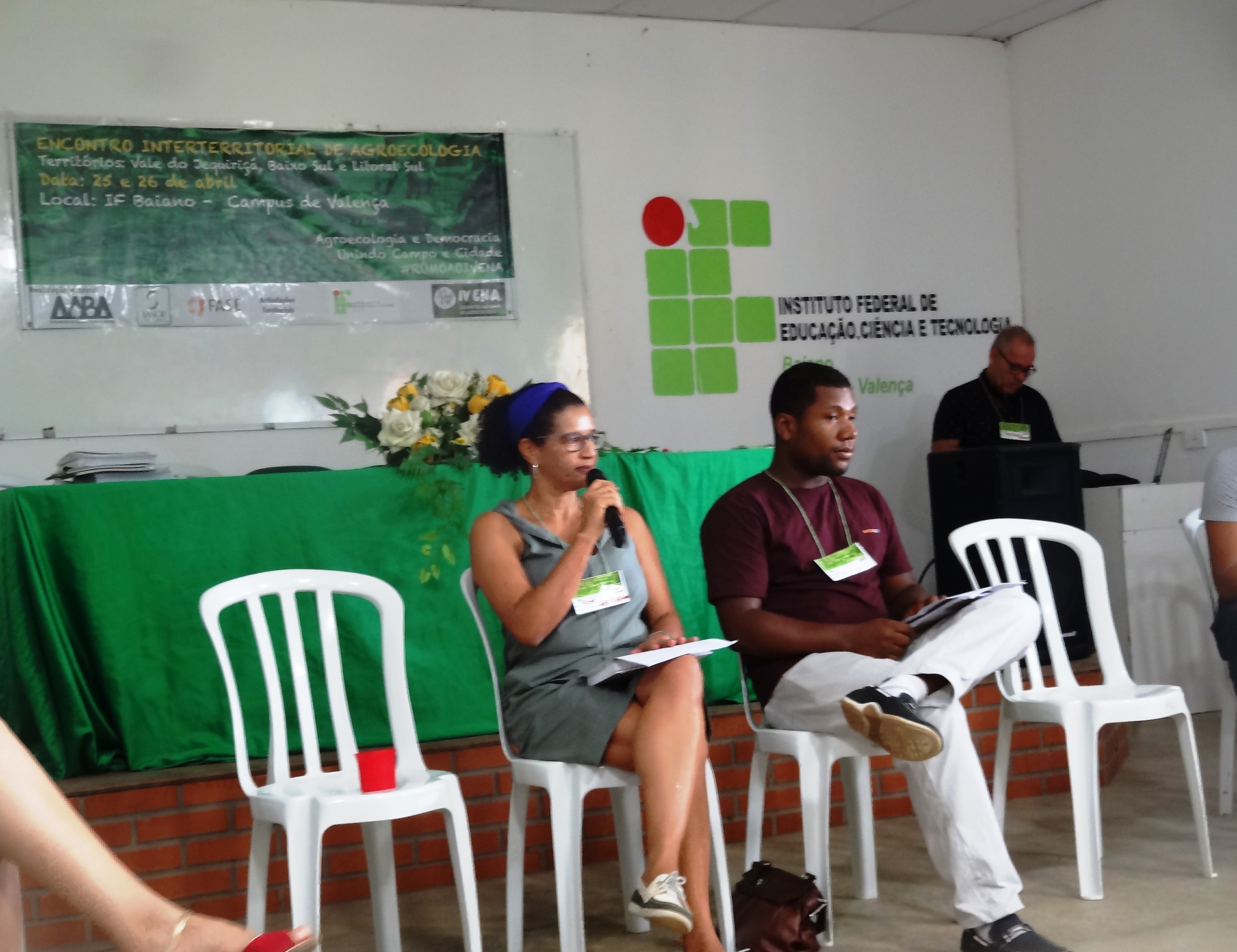 Dentre os diversos temas abordados (terra e território, juventude, construção social de mercado, educação do campo, soberania alimentar), a professora do IF Baiano Campus Santa Inês, Rita Garcia – Coordenadora do Projeto de Extensão Articulação de Mulheres do Vale do Jiquiriçá, participou falando do tema mobilizador “Mulheres e Agroecologia” juntamente com membros do Projeto de Extensão, Aila Cristina Costa e Tânia Santos, estudantes do Curso de Licenciatura em Geografia do IF Baiano Campus Santa Inês e, também, a participante do Projeto, Raimunda Santos, assentada de crédito fundiário do município de Ubaíra.
