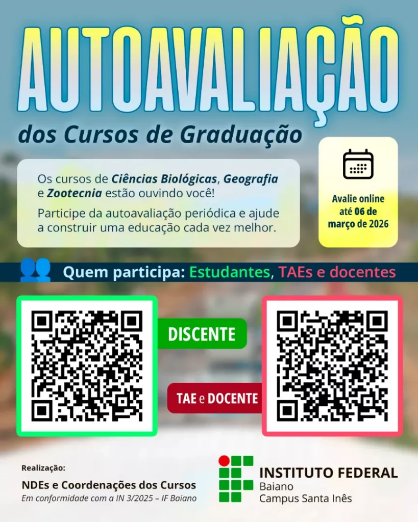 O Instituto Federal de Educação, Ciência e Tecnologia Baiano – Campus Santa Inês está realizando a Autoavaliação dos Cursos de Graduação de Ciências Biológicas, Geografia e Zootecnia, reforçando o compromisso institucional com a qualidade do ensino e a melhoria contínua das ações acadêmicas.