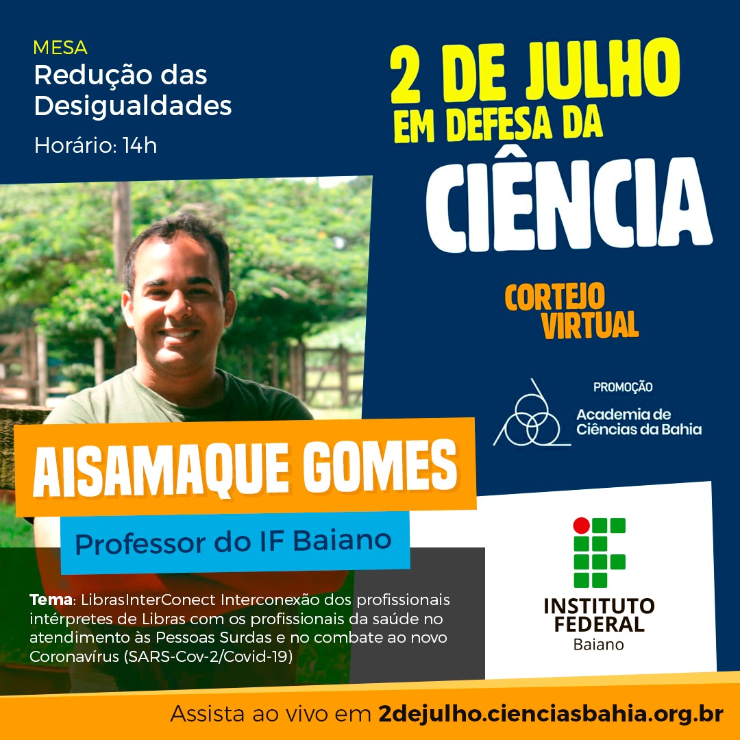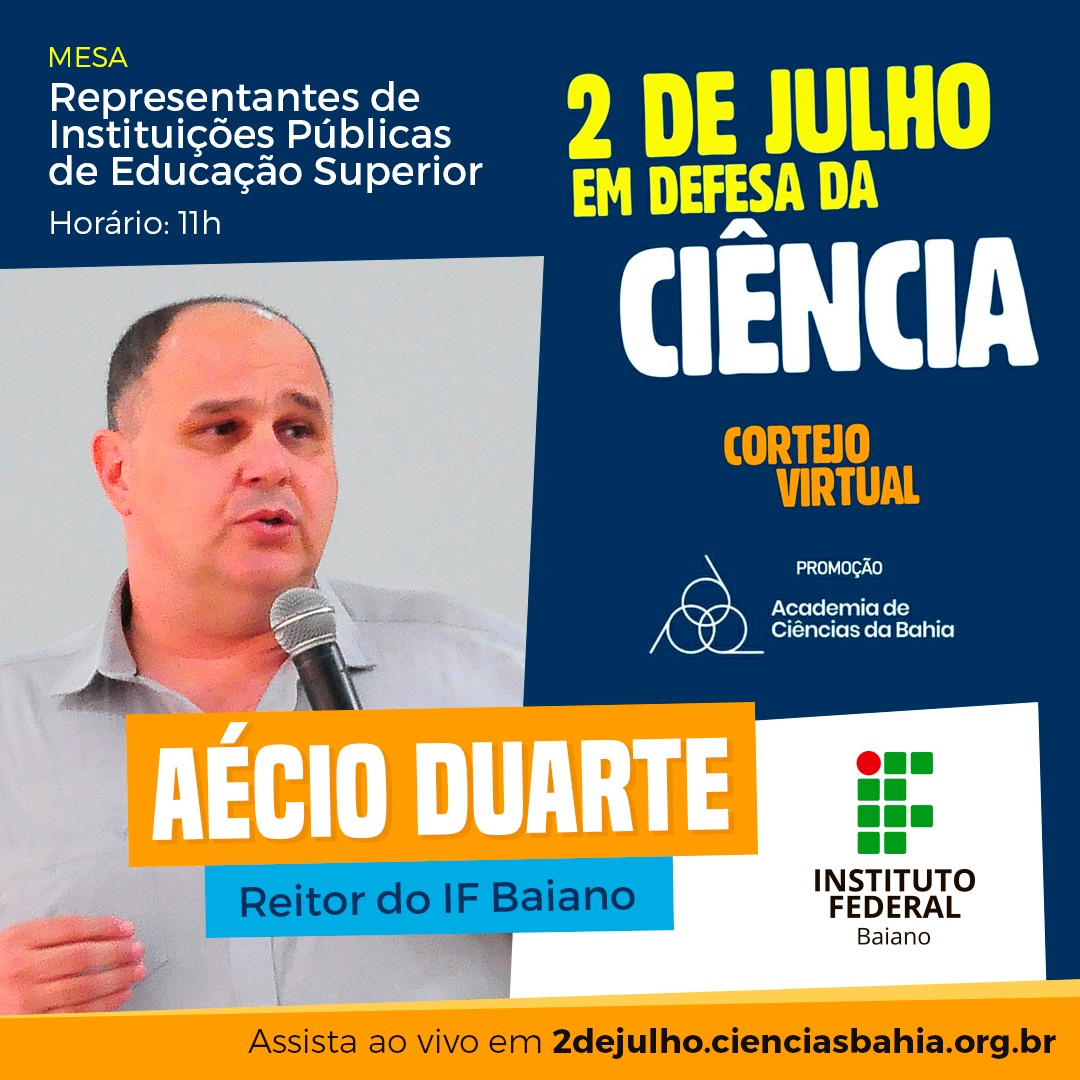 O Instituto Federal de Educação, Ciência e Tecnologia Baiano (IF Baiano) é uma das instituições que participam, nesta quinta-feira, do cortejo virtual “2 de Julho em Defesa da Ciência”, promovido pela Academia de Ciências da Bahia. A manifestação, que tradicionalmente percorre as ruas de Salvador, reunindo professores, estudantes e pesquisadores de instituições de educação do estado, ocorre, desta vez, de forma virtual, por conta da pandemia de Covid-19.