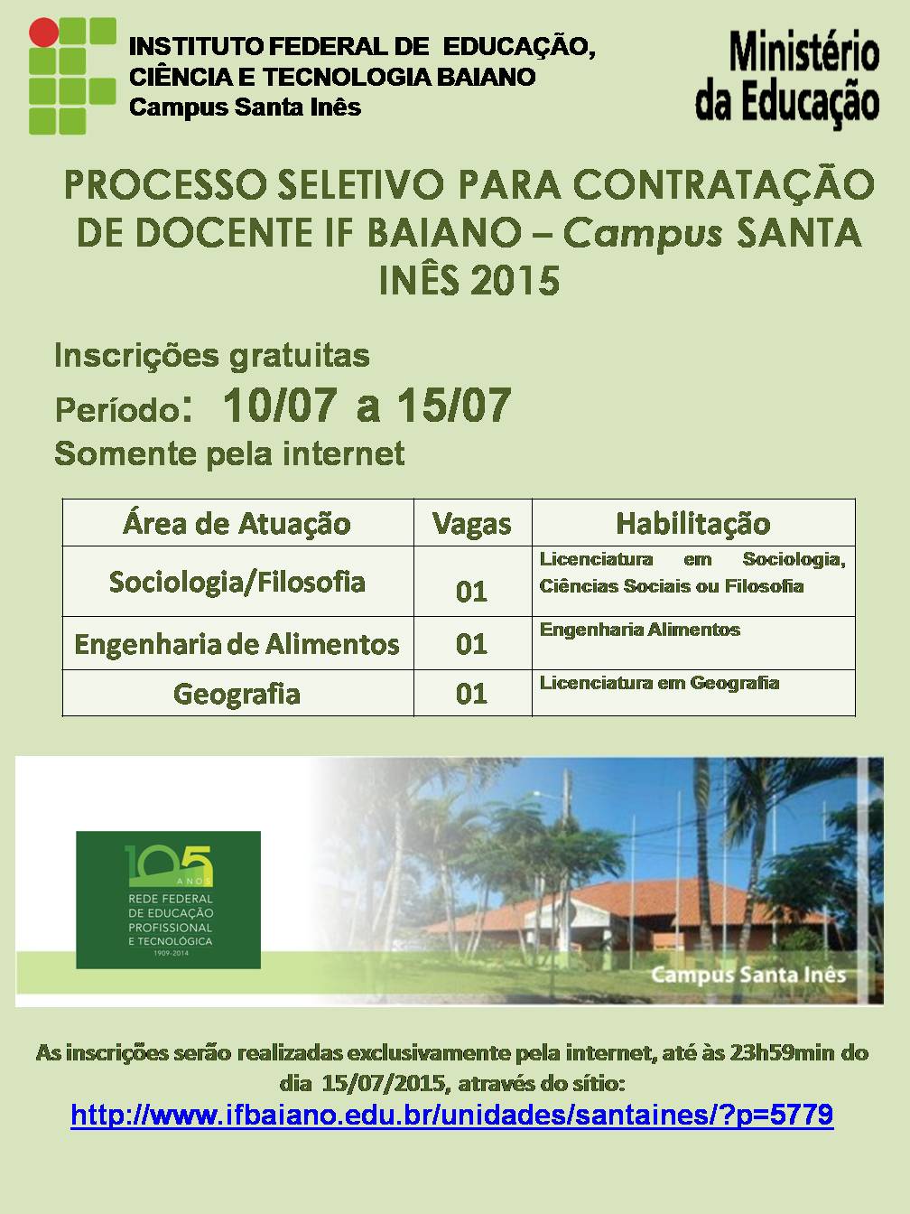 IF Baiano Campus Santa Inês divulga processo seletivo para professor substituto.