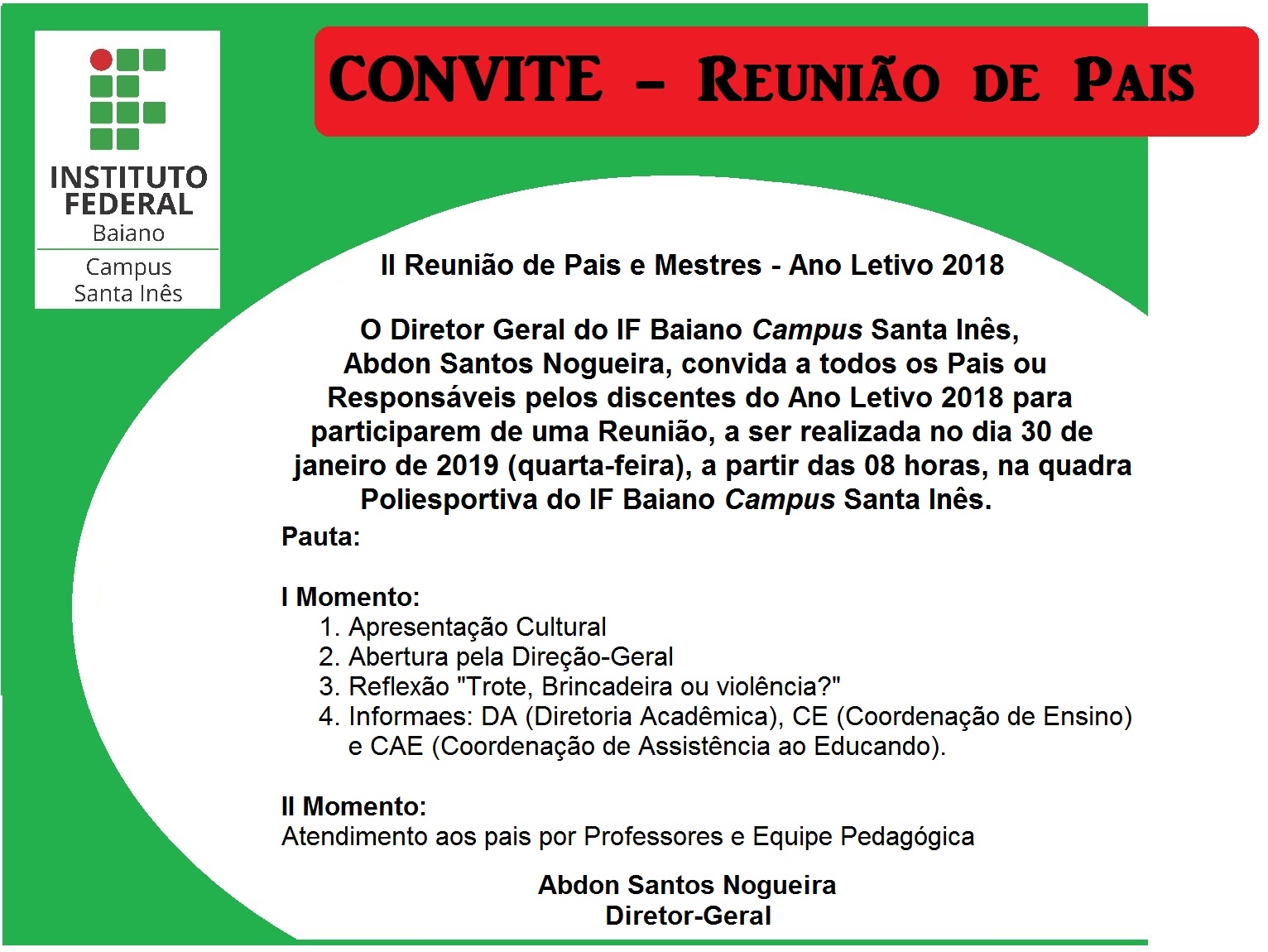 Convite para a 2ª Reunião de Pais e Mestres a ser realizada no Campus Santa Inês, no dia 30 de janeiro de 2019, a partir das 08 horas.