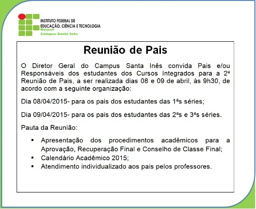O Diretor Geral do Campus Santa Inês convida Pais e/ou Responsáveis dos estudantes dos Cursos Integrados para a 2ª Reunião de Pais, a ser realizada dias 08 e 09 de abril, às 9h 30min