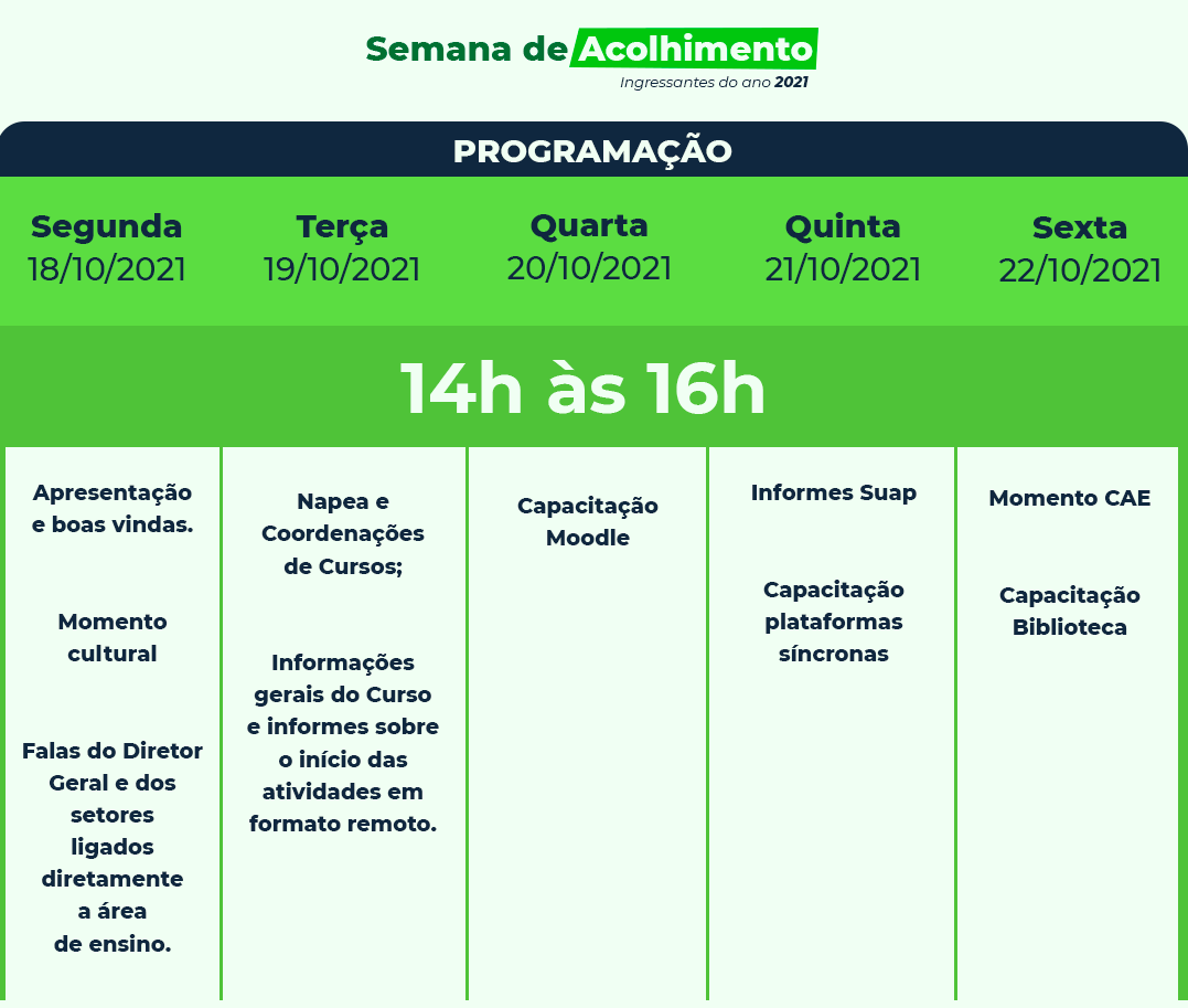 Das atividades programadas para a semana, além da acolhida, apresentações, momento cultural, estão previstas capacitações nos programas e plataformas digitais que serão utilizadas pelos(as) estudantes.