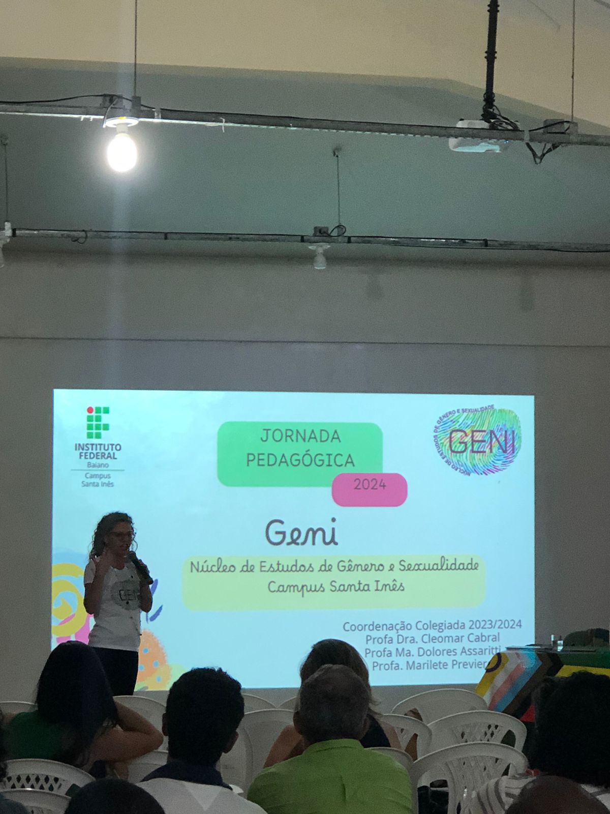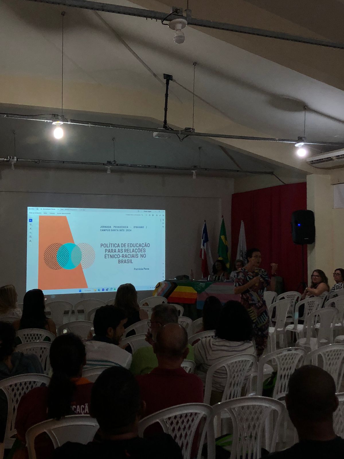 Com o retorno das atividades letivas, no IF Baiano – Campus Santa Inês, aconteceu, no auditório da biblioteca do campus, durante esta semana, 06 a 08 de fevereiro, a Jornada Pedagógica 2024. Com o tema “Relações Étnico-Raciais e de Gênero no Cotidiano Escolar: Pensando os conteúdos, conhecimentos, saberes e práticas escolares”, aconteceram discursões e aprendizados foram trocados por servidores presentes. Logo na manhã do dia 6, primeiro dia da jornada, servidores(as) presentes foram recepcionados com um café da manhã, no auditório do Campus. Já no auditório, após a abertura da semana pelo Diretor Acadêmico, professor André Leonardo e pela Coordenadora de Ensino, professora Tharcilla Pessoa, que deu as boas vindas a todas as pessoas presentes, a professora Marilete Previero declamou o poema “Aviso da Lua que menstrua” de Elisa Lucinda.