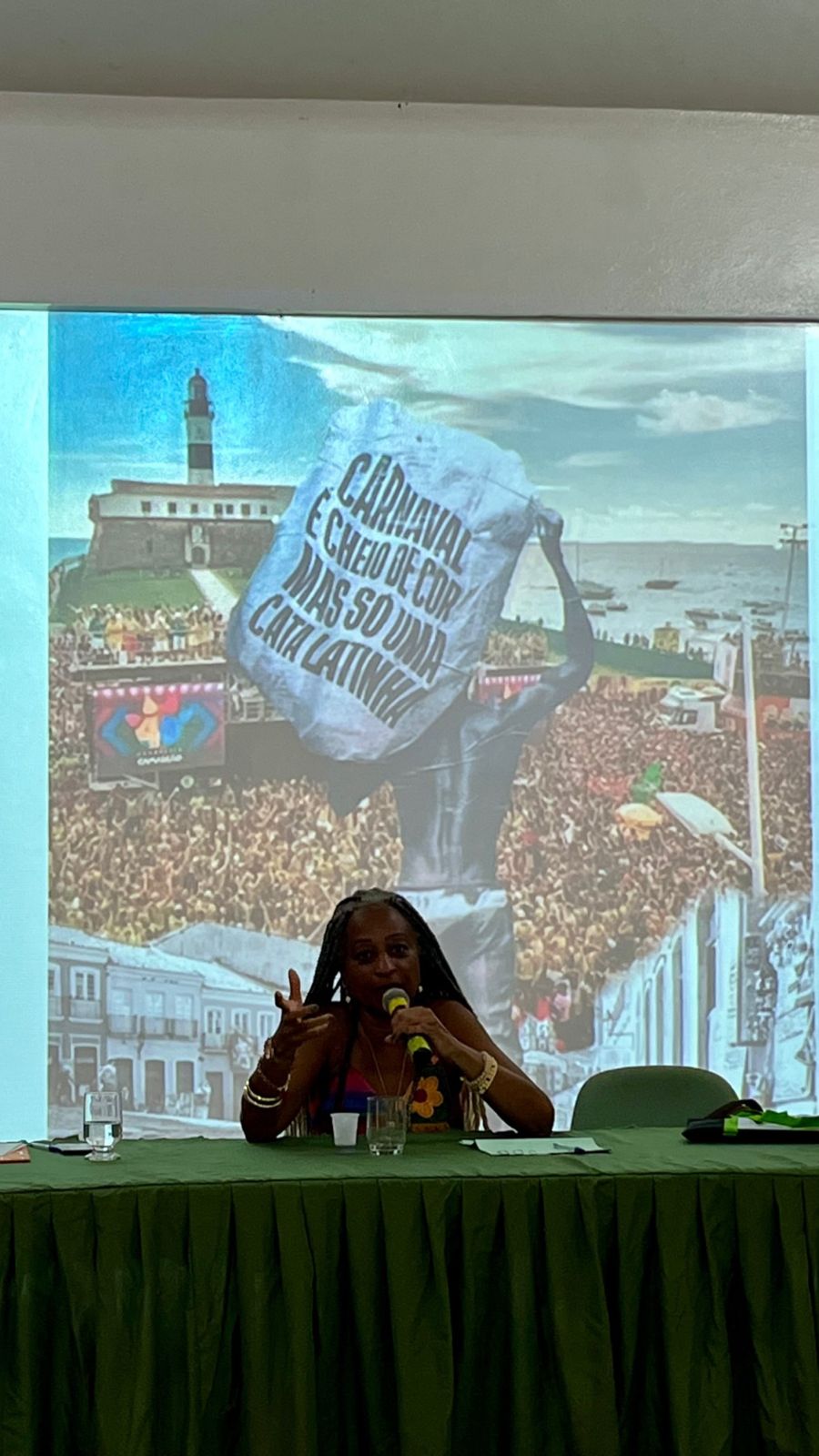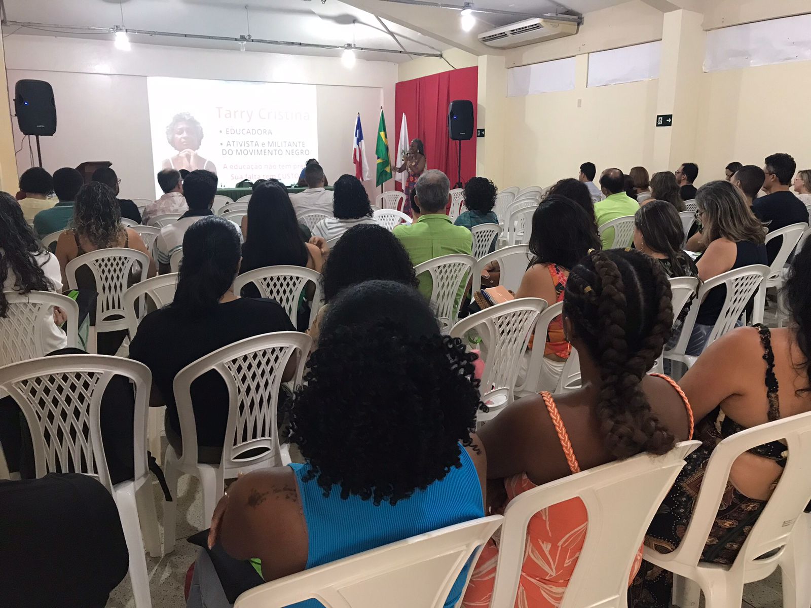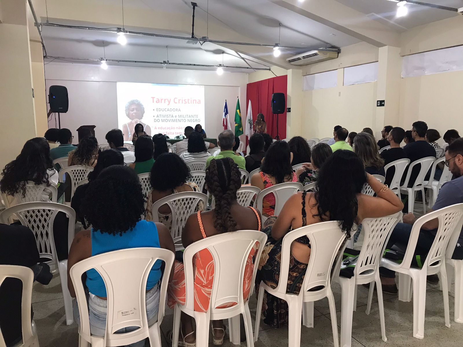 Com a palestra, “África em nós: Os valores civilizatórios afro-brasileiros na constituição de uma sociedade diversa, a professora Tarry Pereira trouxe um leque de informações e relatos e situações reais para discussão. Tarry Cristina Santos Pereira é graduada em Pedagogia, especialista em psicopedagogia clinica, institucional e gestão escolar, colaboradora do GRUMAP – Grupo de mulheres do Alto das Pombas e do Instituto Cultural Steve Biko.