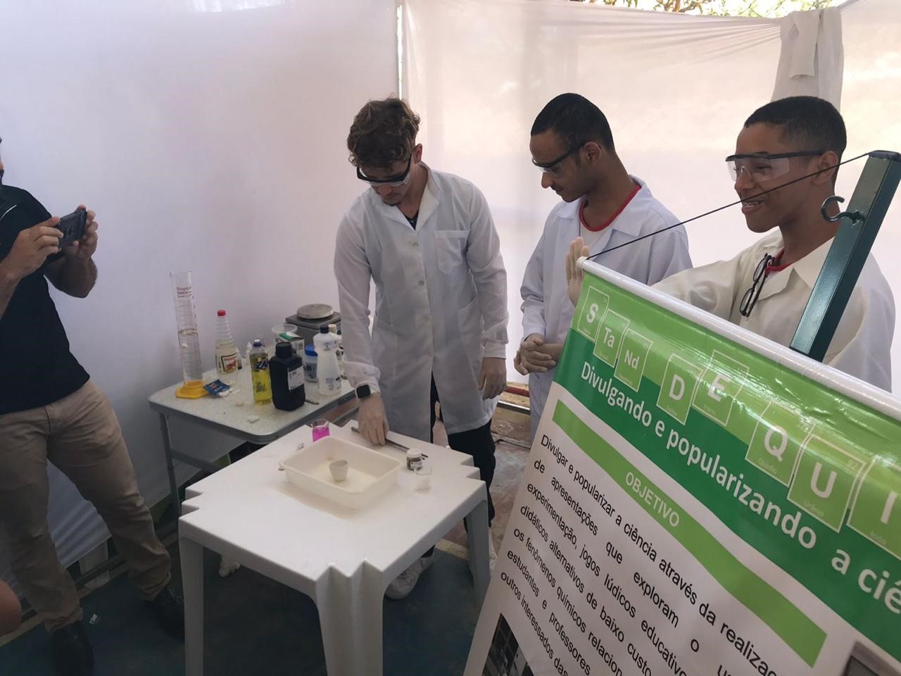 – No estande de química (aliado ao GEQUIM – Grupo de estudo de química) foi explicado o objetivo da divulgação e popularização do saber científico e suas ferramentas para essa divulgação (jogos lúdicos, experimentações, feiras).