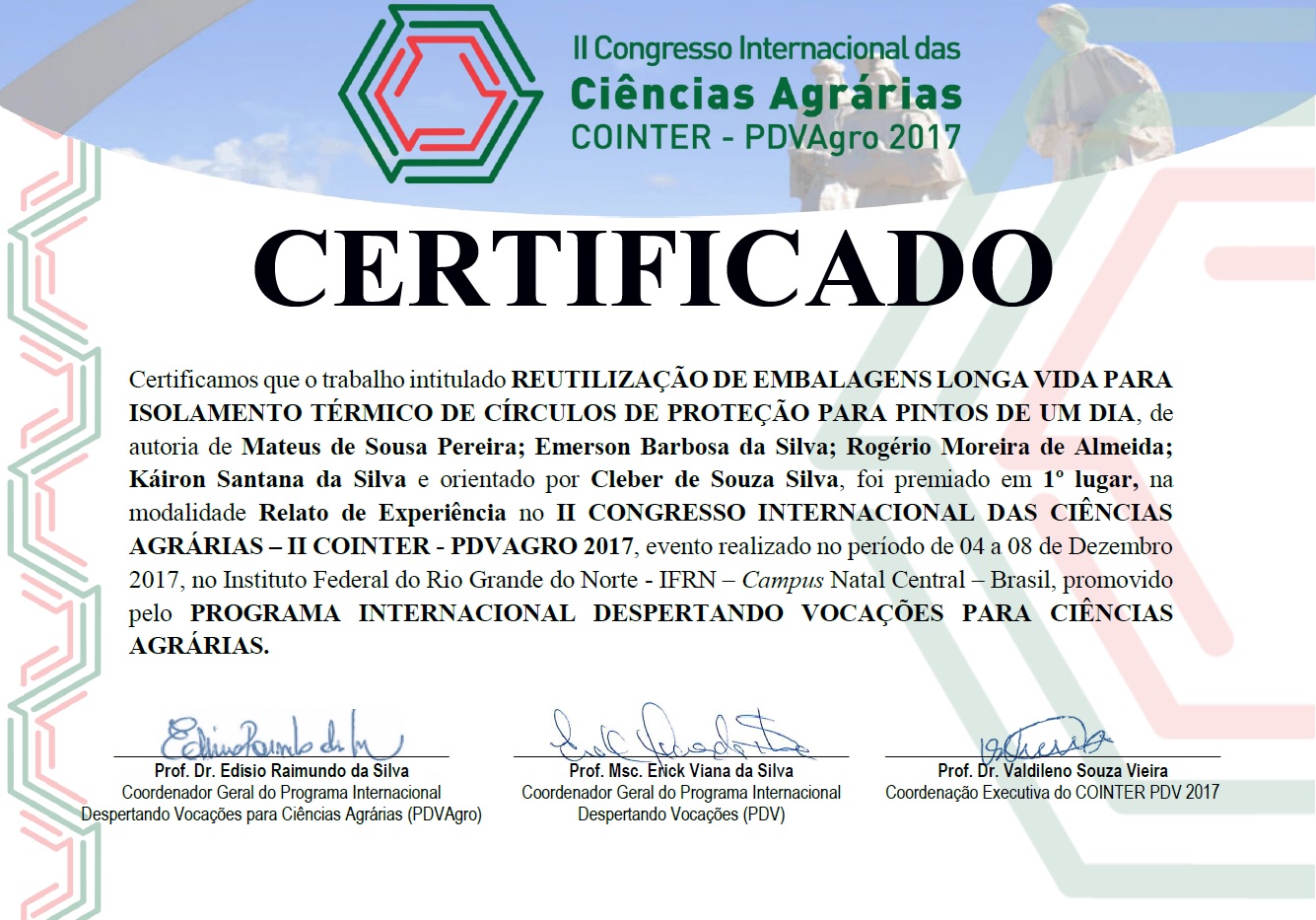 O projeto de extensão “REUTILIZAÇÃO DE EMBALAGENS LONGA VIDA PARA ISOLAMENTO TÉRMICO DE CÍRCULOS DE PROTEÇÃO PARA PINTOS DE UM DIA” desenvolvido pelos estudantes do Grupo de Estudos Galileu Galilei do IF Baiano Campus Santa Inês, na comunidade Mutuipinho-Mutuípe-BA, obteve o reconhecimento máximo durante o II CONGRESSO INTERNACIONAL DAS CIÊNCIAS AGRÁRIAS – II COINTER – PDVAGRO 2017, na modalidade Relato de Experiência.
