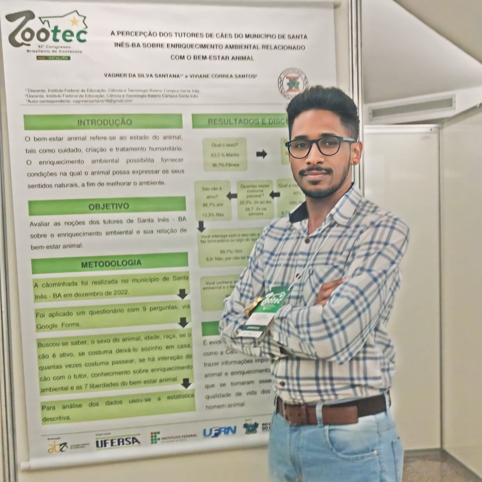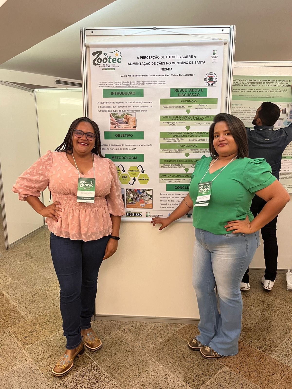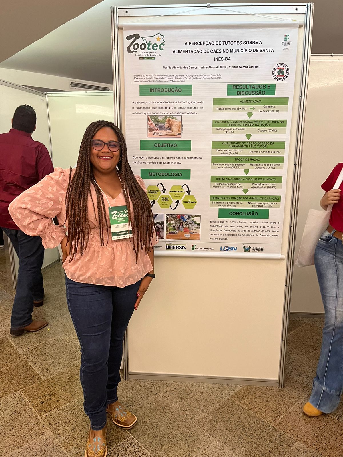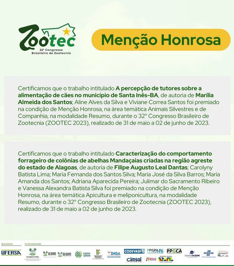 Neste evento o trabalho intitulado “A percepção de tutores sobre a alimentação de cães no município de Santa Inês-BA”, de autoria dos graduandos Marília Almeida dos Santos, Aline Alves da Silva e da professora Viviane Correa Santos, foi premiado na condição de Menção Honrosa. Os dados deste trabalho foram coletados durante a “1ª Cãominhada Solidária de Santa Inês-BA”, realizada por discentes do Bacharelado em Zootecnia, no dia 10 de dezembro de 2022; atividade extensionista em que os discentes levaram informações a comunidade de Santa Inês sobre Nutrição, Bem estar e Sanidade Animal.