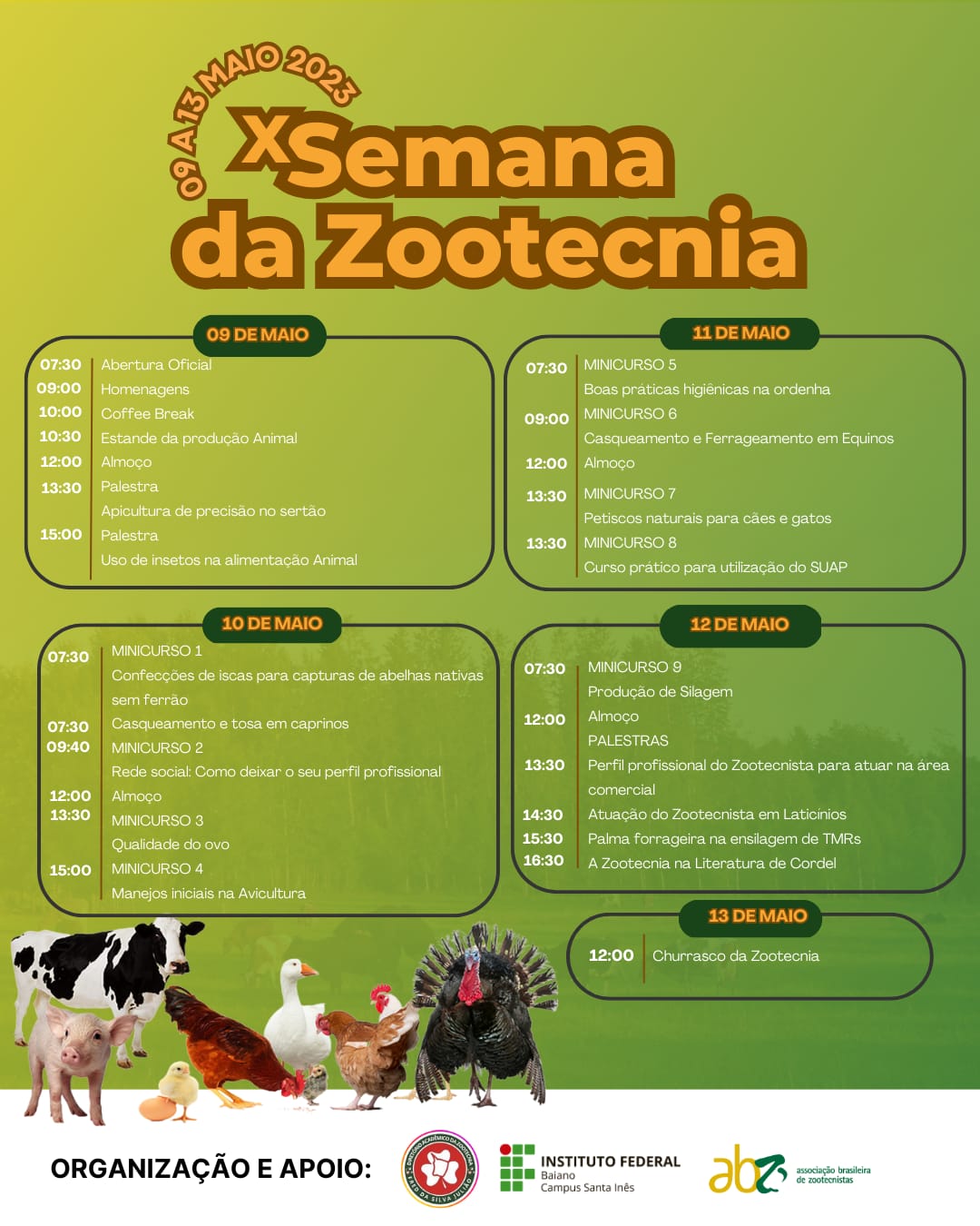 A X Semana da Zootecnia ocorrerá entre os dias 09 a 13 de Maio. Com o tema “O protagonismo estudantil para o desenvolvimento de novas habilidades”, o evento busca valorizar o papel dos estudantes na área.