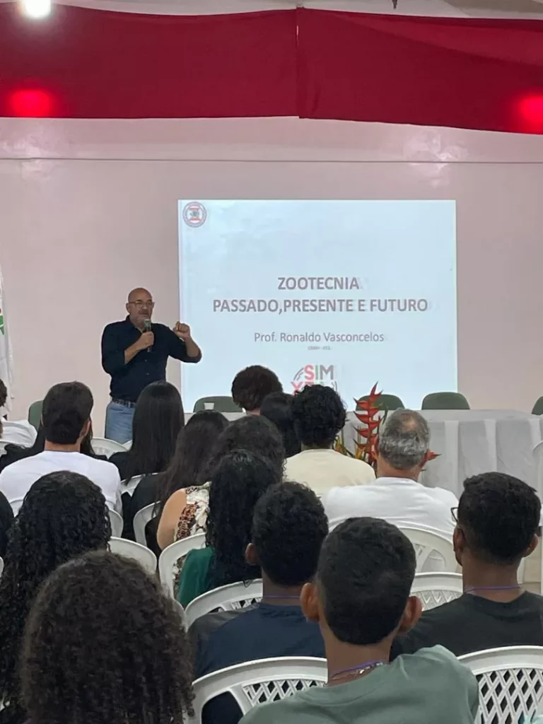 A programação de palestras teve início com o professor Ronaldo Vasconcelos, que conduziu o público por uma linha do tempo sobre “Zootecnia: Passado, Presente e Futuro”, provocando reflexões sobre os avanços e desafios da área.