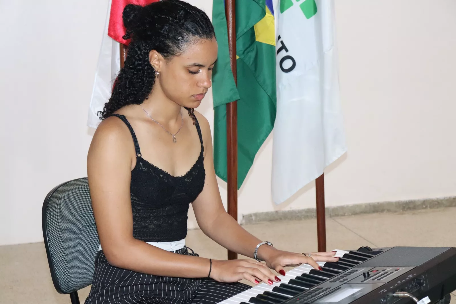 Enquanto os convidados chegavam, foram recepcionados pela estudante Lorena dos Santos, do curso Técnico em Alimentos do Campus, que encantou a todos com uma delicada apresentação de piano, criando uma atmosfera acolhedora para o início das atividades.