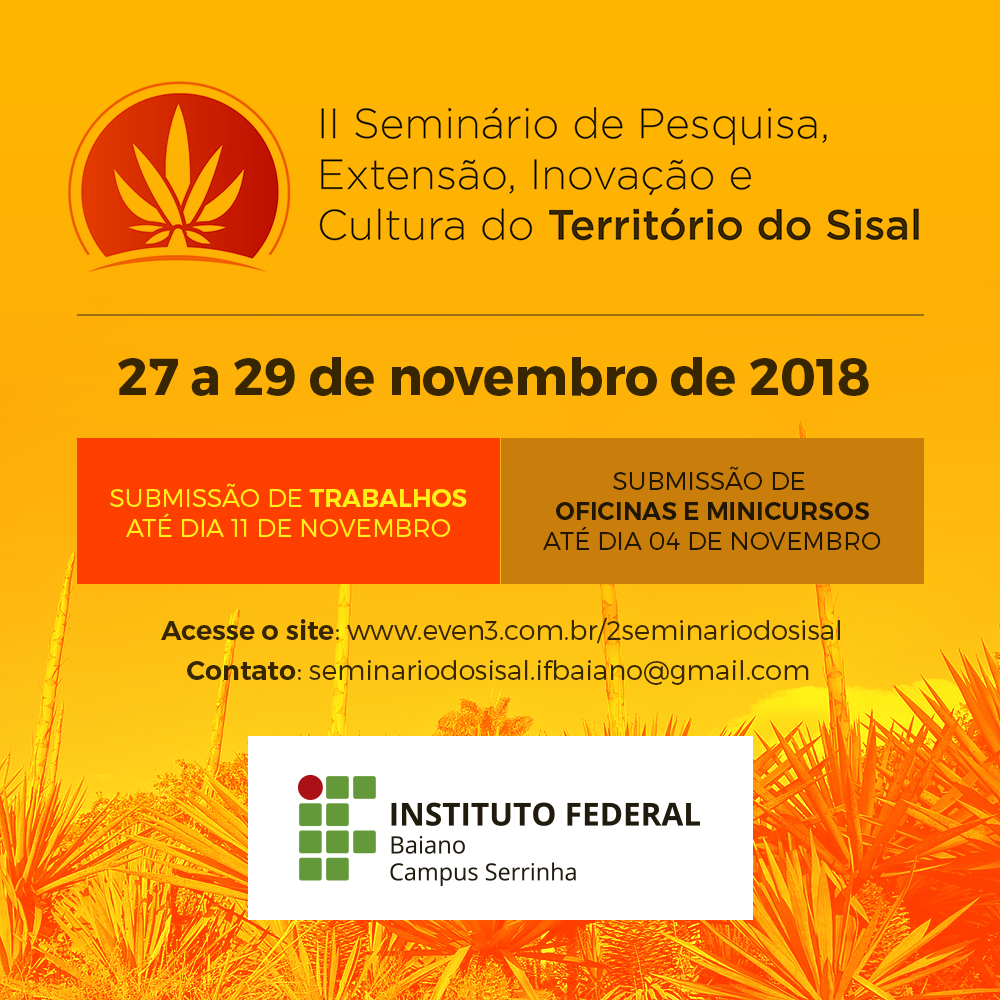 O Instituto Federal Baiano informa que estão abertas as inscrições para o II Seminário de Pesquisa, Extensão, Inovação e Cultura do Território do Sisal, o qual acontecerá entre os dias 27 e 29 de novembro de 2018, no IF Baiano – Campus Serrinha.