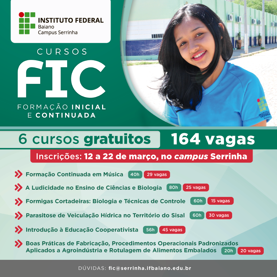 O Reitor do Instituto Federal de Educação, Ciência e Tecnologia Baiano – IF Baiano, no uso da competência delegada pelo Decreto de 25 de abril de 2018, publicado no Diário Oficial da União em 26 de abril de 2018, Seção 2, Página 1, no uso de suas atribuições legais, torna pública a abertura de inscrições para provimento de vagas em cursos de Qualificação Profissional, na modalidade de Formação Inicial e Continuada – FIC que serão ofertados no Campus Serrinha.
