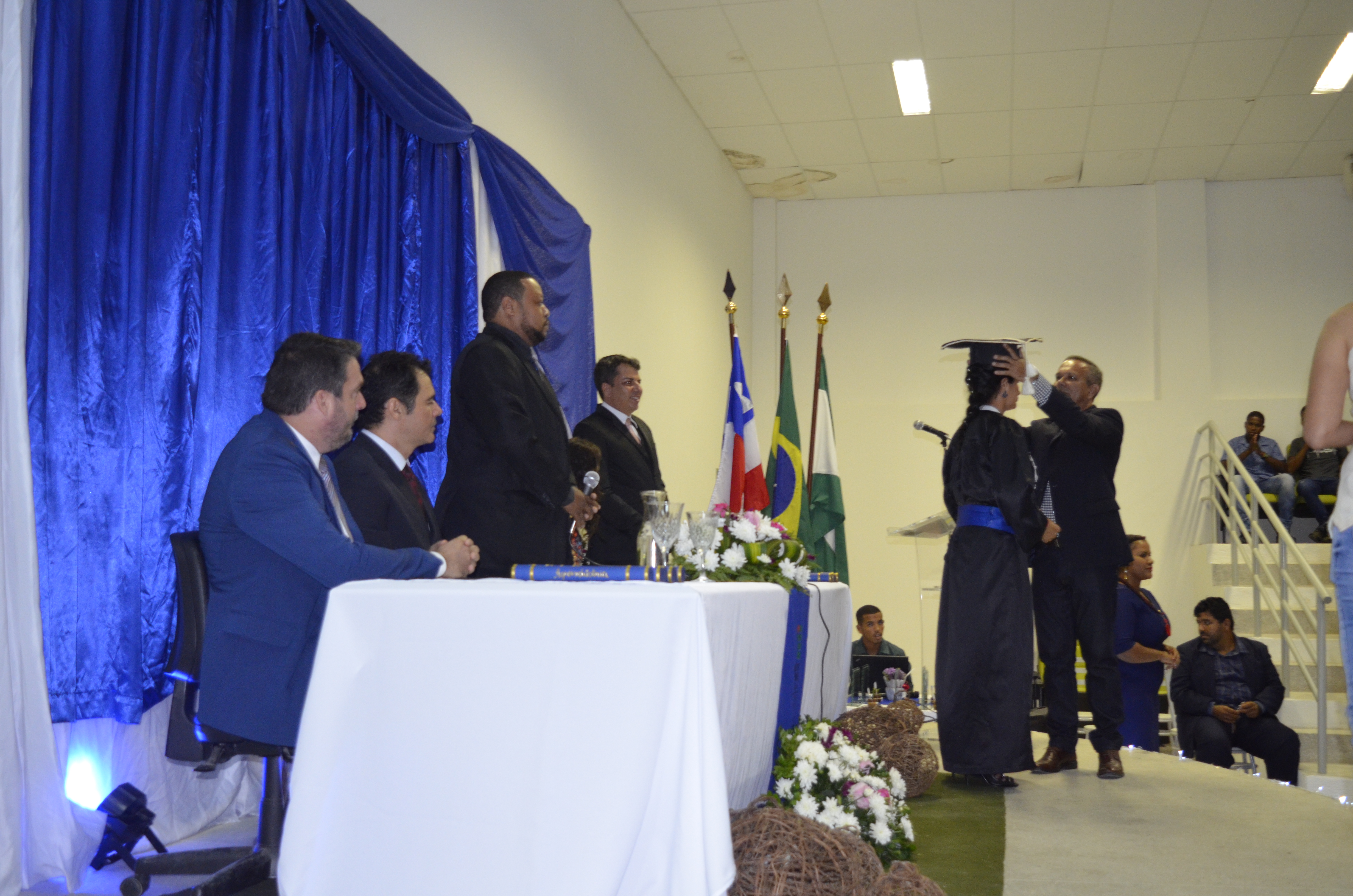A mesa de honra foi composta pelo Diretor Geral Leandro dos Santos Damasceno, o Diretor Acadêmico Clayton Moura de Carvalho, a Coordenadora do curso Técnico Integrado em Agroindústria modalidade PROEJA Neyla Reis e o paraninfo da turma Sandro Magalhães.