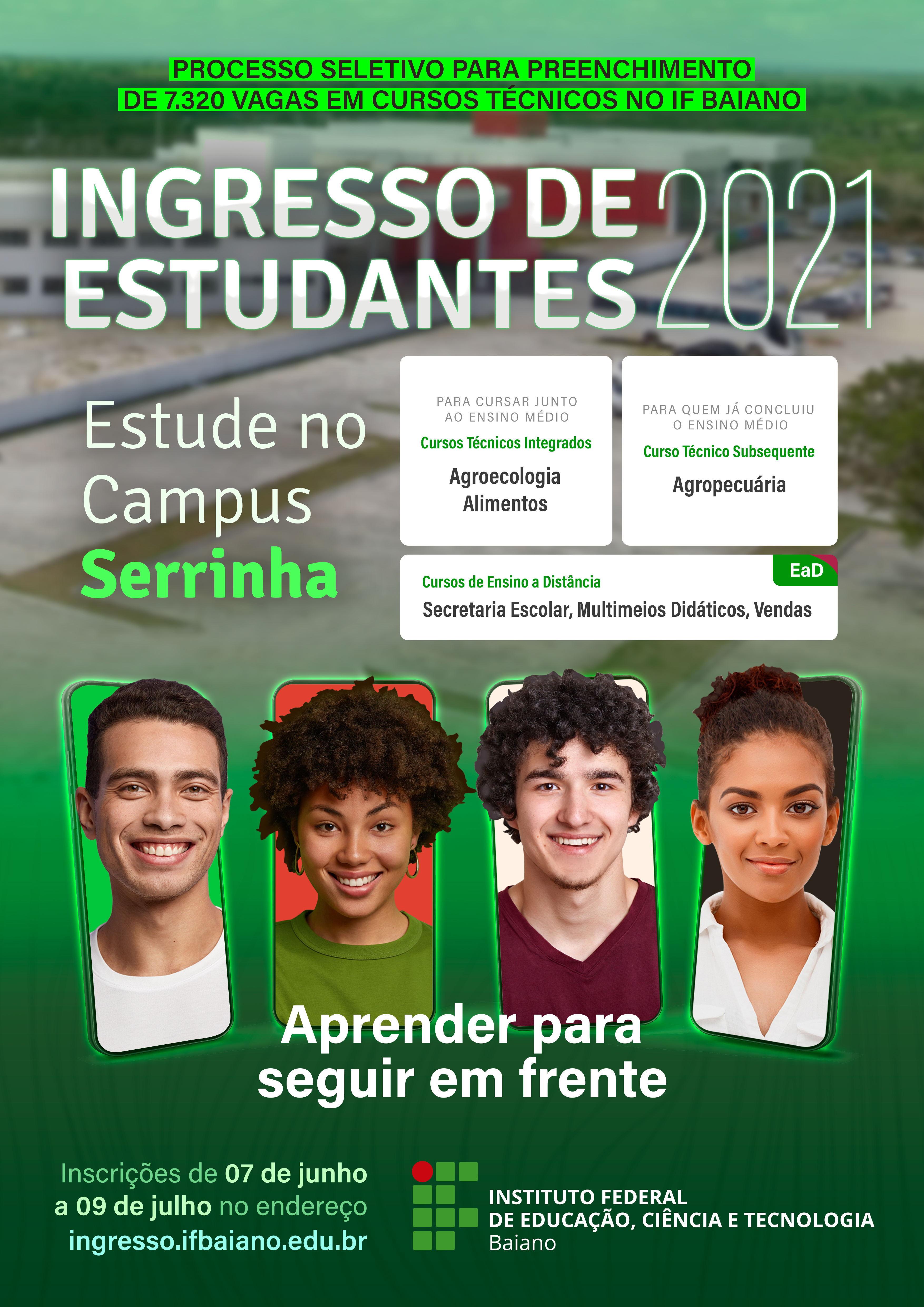 O Instituto Federal Baiano (IF Baiano) lançou os editais do processo seletivo para ingresso de estudantes em cursos técnicos de nível médio. Estão disponíveis 7.320 vagas em cursos das modalidades Integrada ou Subsequente e no formato de Educação à distância. Desse total, 240 vagas são para cursos ofertados pelo Campus Serrinha. Para concorrer, interessados devem realizar inscrição no período de 7 de junho a 9 de julho, exclusivamente no site da Fundação CEFETMINAS. Ao preencher o formulário de inscrição, os candidatos poderão optar por duas opções de curso, indicando a ordem de preferência, campus, semestre de oferta e turno para cada uma delas. Candidatos também devem sinalizar em qual categoria desejam concorrer. Para os cursos Integrados, o IF Baiano reserva 70% das vagas para candidatos que cursaram o Ensino Fundamental integralmente na rede pública de ensino. Das demais vagas, 25% destinam-se a candidatos da Ampla Concorrência e 5% para pessoas com deficiência. Para os Subsequentes, 50% das vagas se destinam a candidatos que cursaram o Ensino Médio integralmente na rede pública de ensino, 45% para ampla concorrência e 5% para pessoas com deficiência.