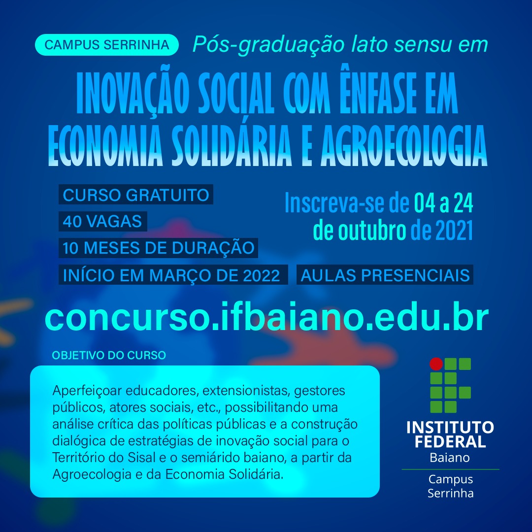 Acesse para mais informações: concurso.ifbaiano.edu.br/portal/pos-ises-serrinha-setembro-2021/