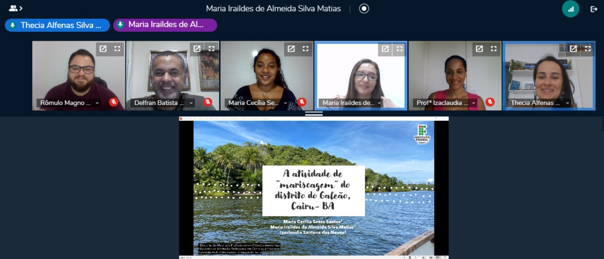 O trabalho foi realizado sob orientação da professora Maria Iraildes Matias (IF Baiano campus Valença) e co-orientação da professora Izaclaudia Santana das Neves (IFC). A banca examinadora foi composta pelos professores Rômulo Magno Oliveira de Freitas (IFRN), Thecia Alfenas Paes (IF Baiano – Campus Valença) e Delfran Batista dos Santos (IF Baiano – Campus Serrinha). A pró-reitora de Pesquisa e Inovação do IF Baiano, Luciana Mazzutti, também acompanhou a apresentação. O trabalho retratou como a atividade de mariscagem é realizada na Comunidade Quilombola do Galeão, o perfil das marisqueiras e os impactos ambientais envolvidos na atividade.