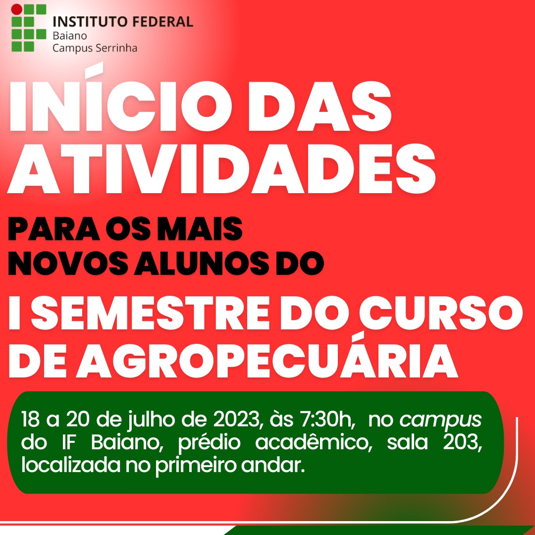 No próximo dia 18 de julho, terça-feira, será o início das atividades para os mais novos alunos do I semestre do curso de Agropecuária.