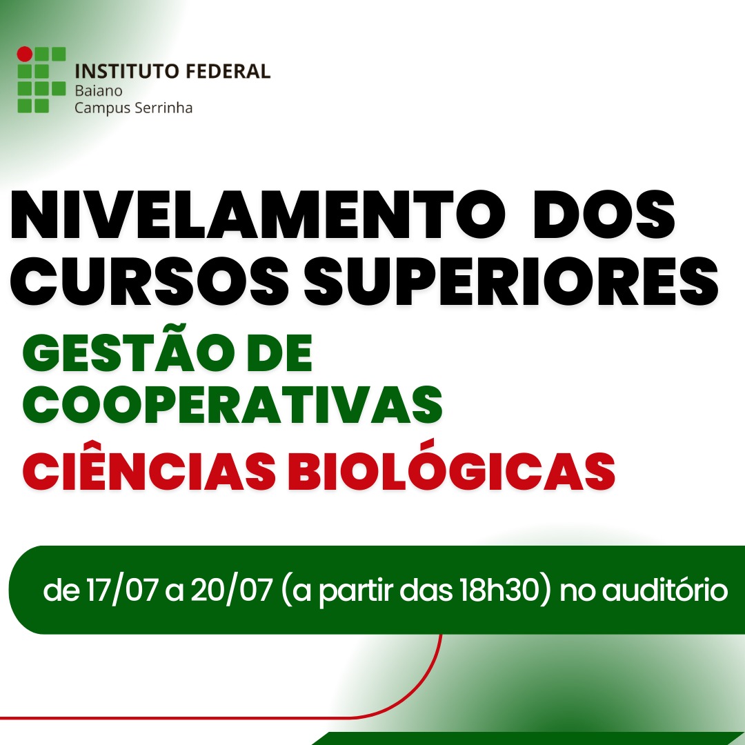O nivelamento dos cursos superiores Gestão de Cooperativas e Ciências Biológicas, ocorrerá de 17/07 a 20/07 (a partir das 18h30) no auditório.
