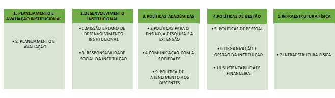 A comissão avalia aspectos estruturados em cinco eixos e dez dimensões. Por meio de questionários, rodas de conversa e visitas in loco destinados a comunidade acadêmica e local: