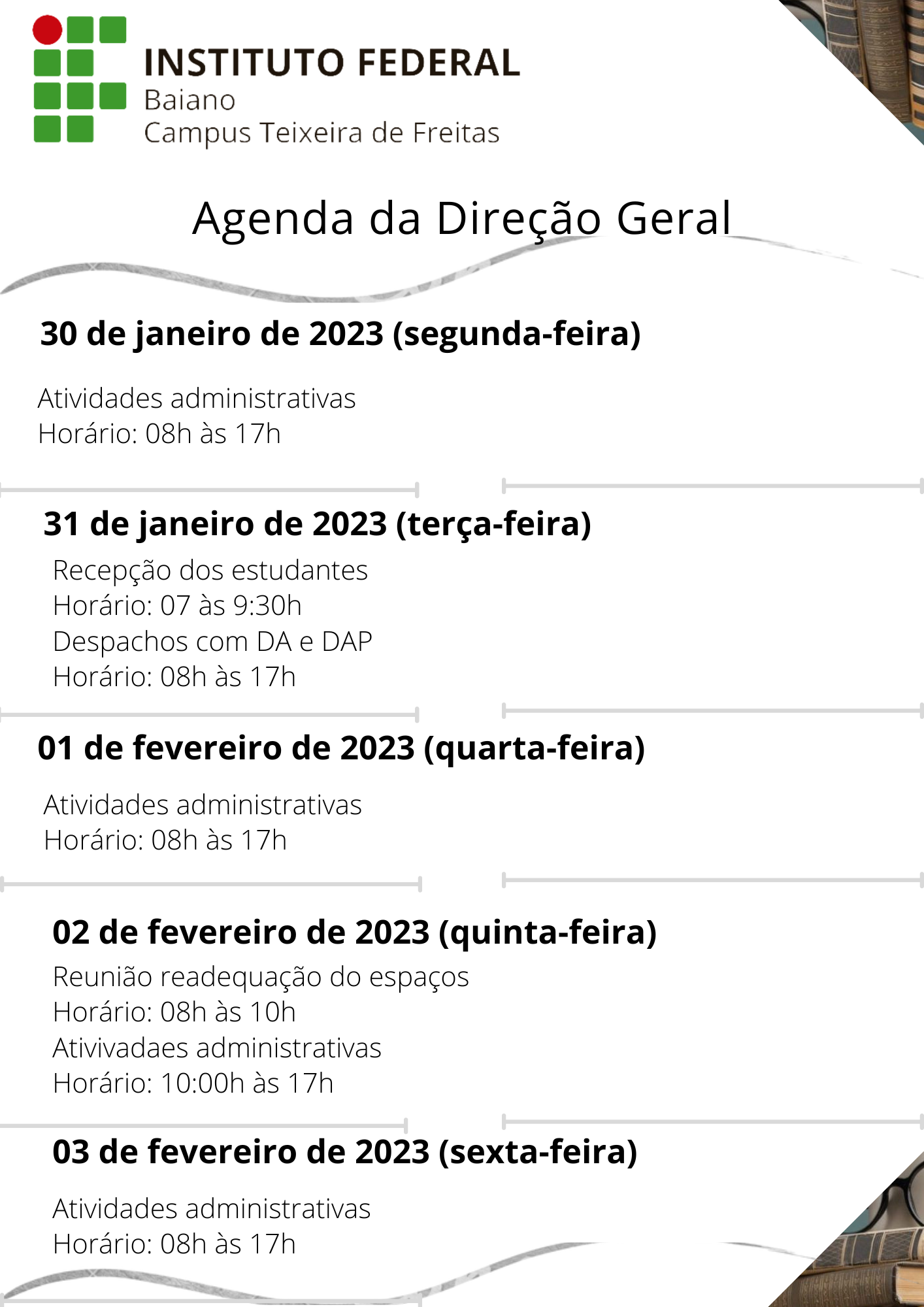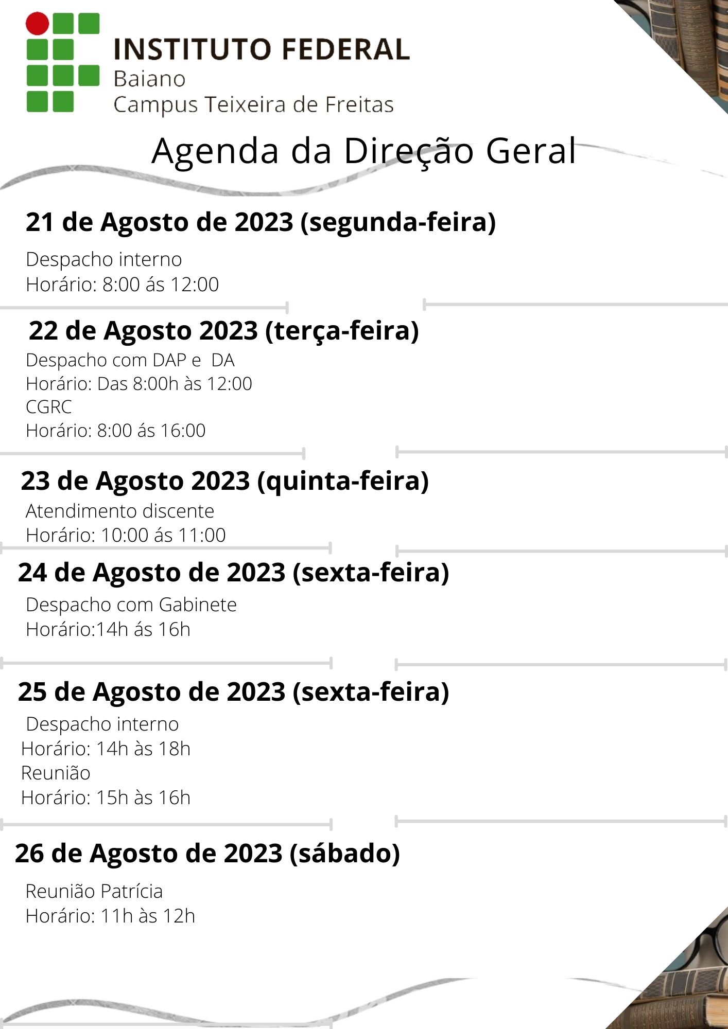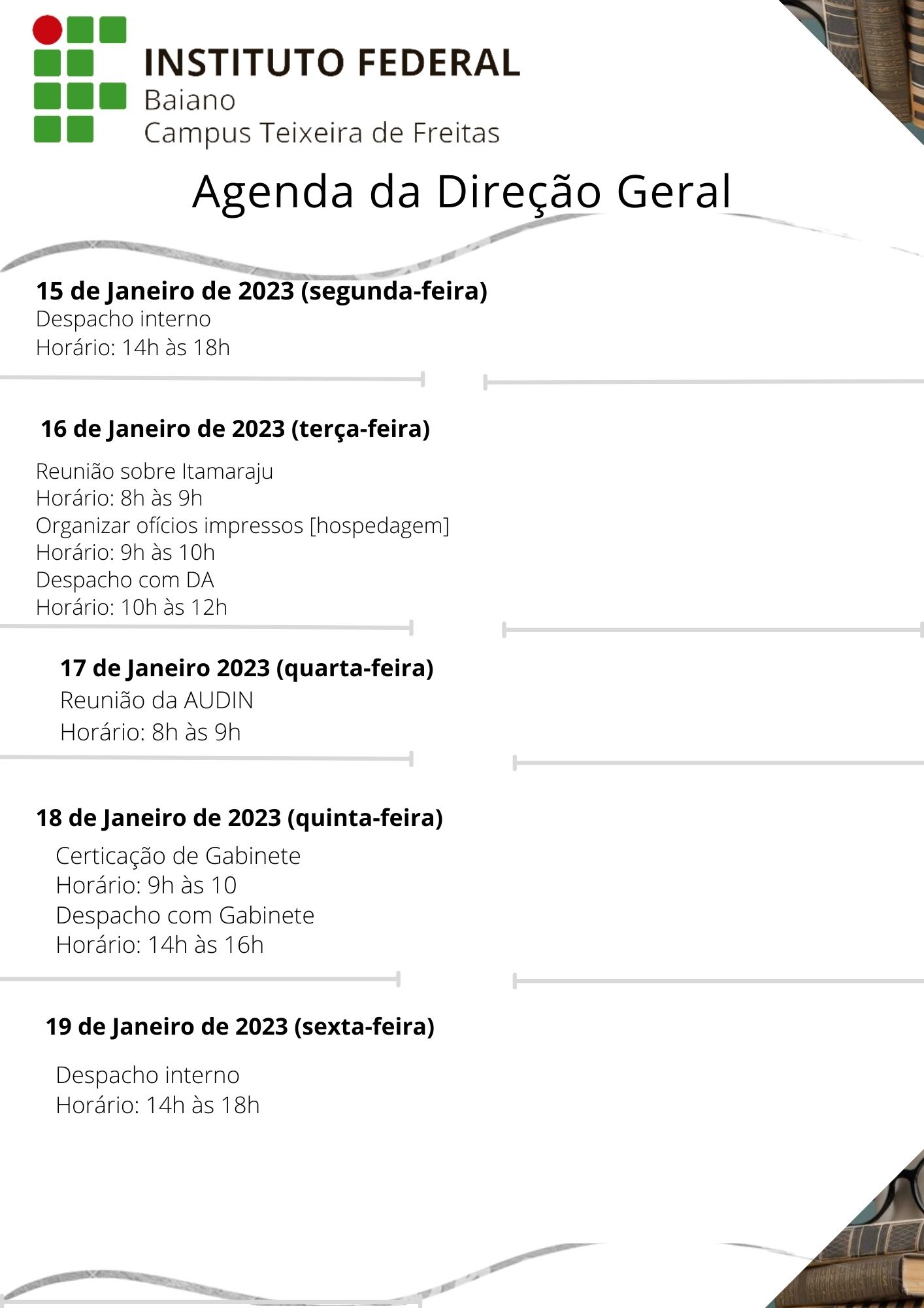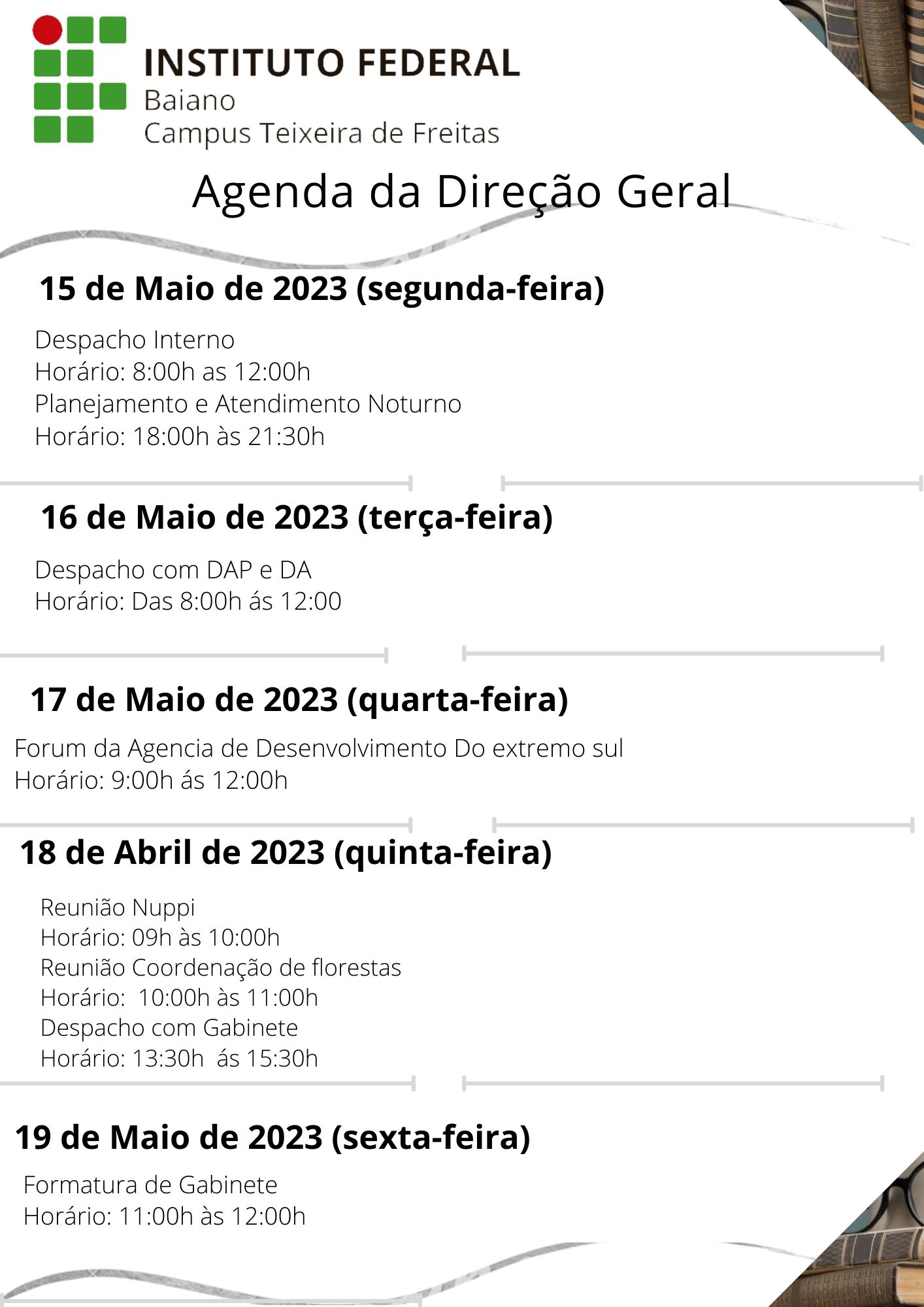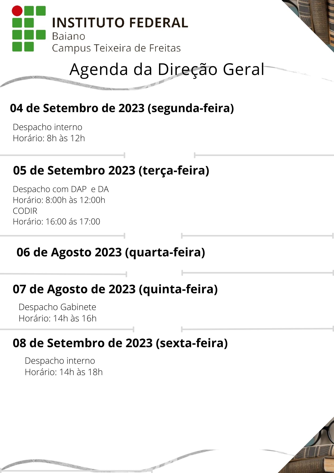 Visualize a Agenda da Direção do Campus Teixeira de Freitas abaixo ou acesse este link.