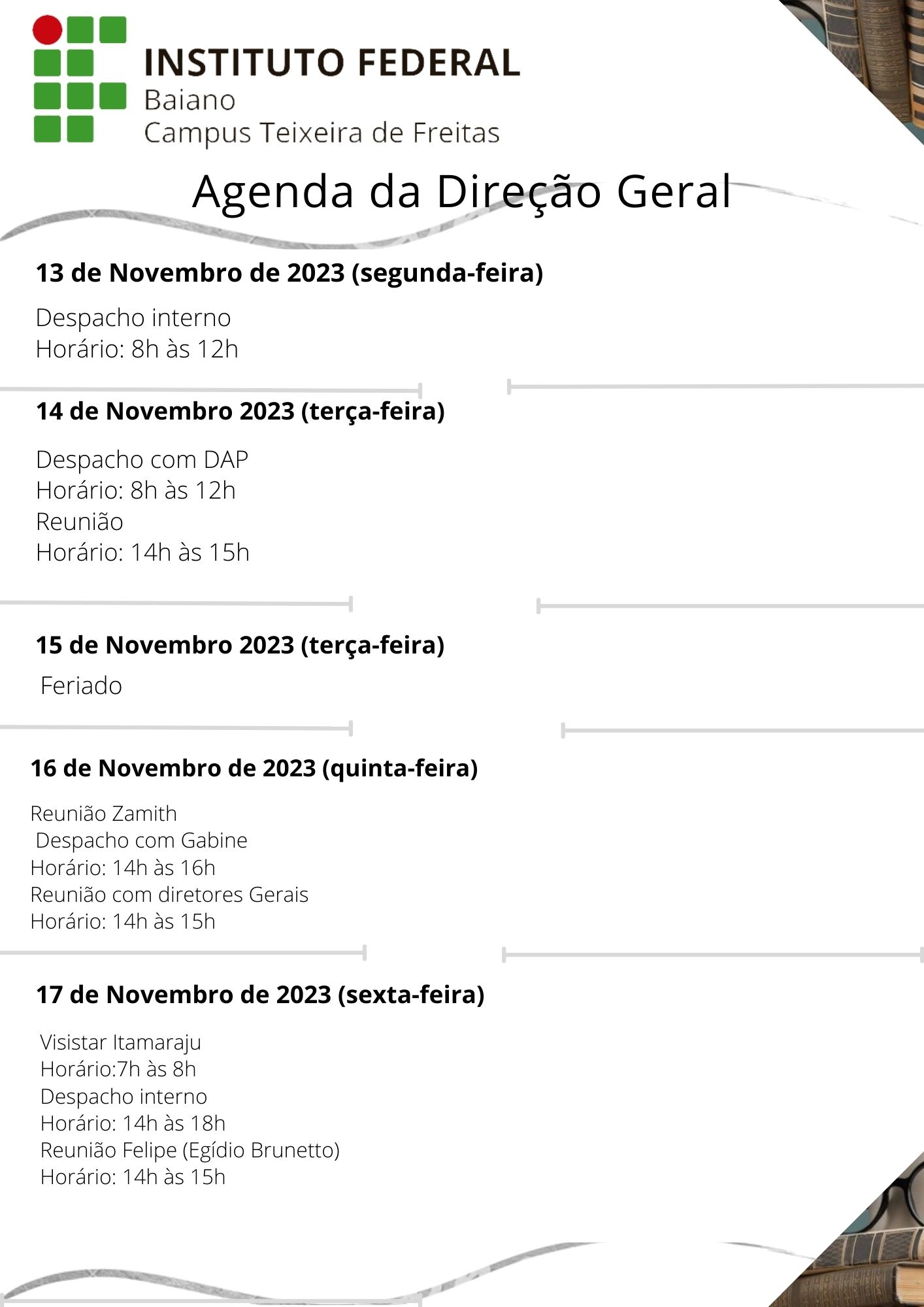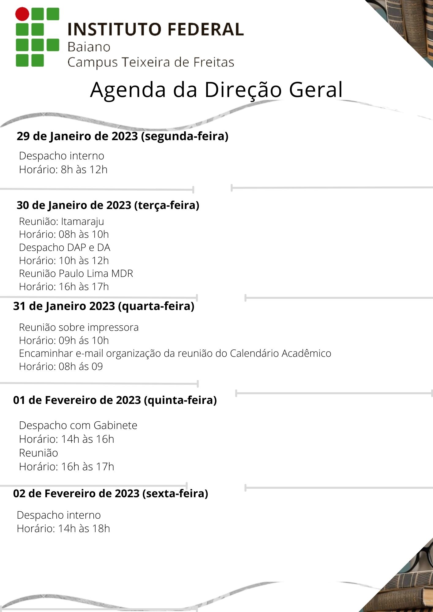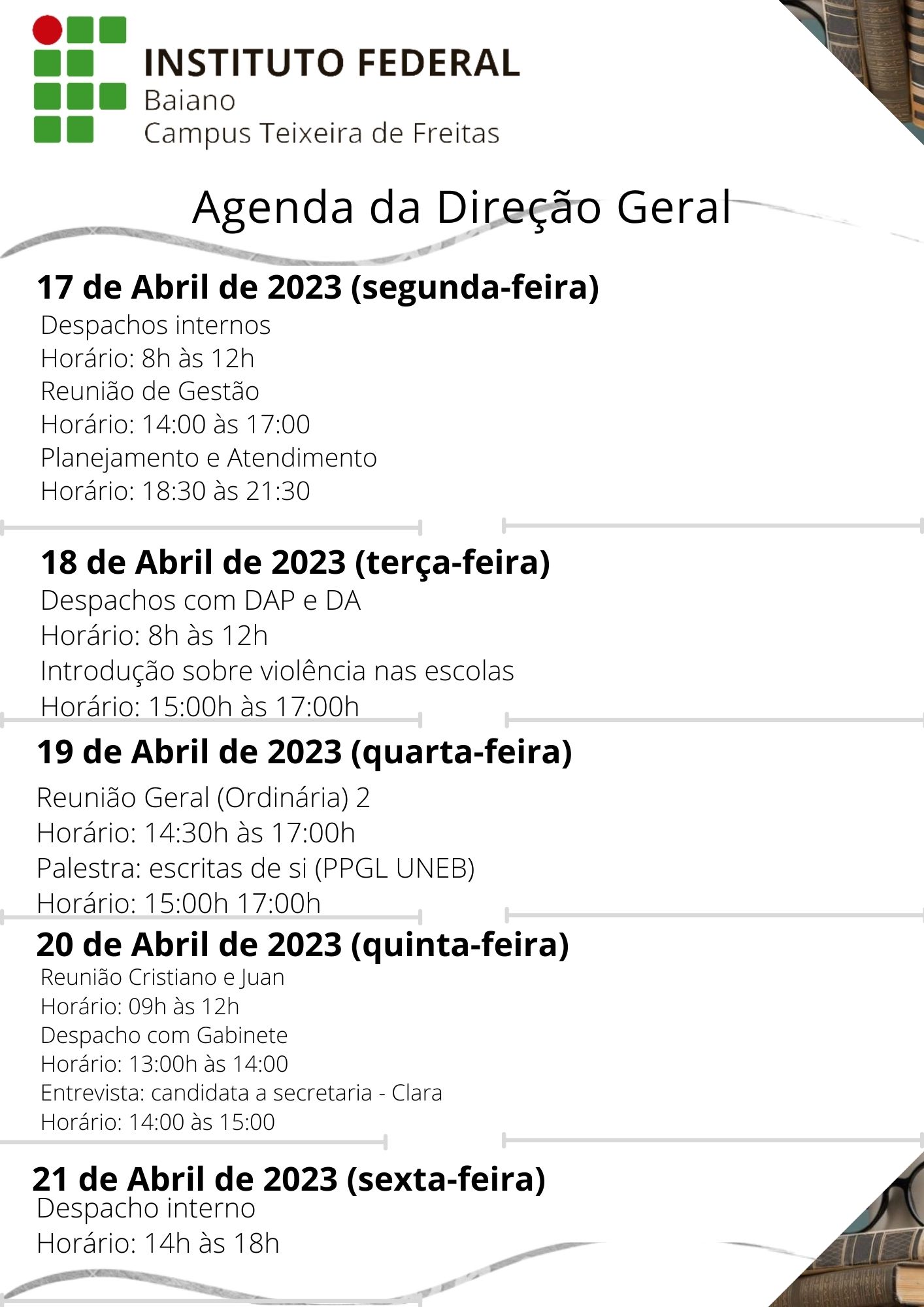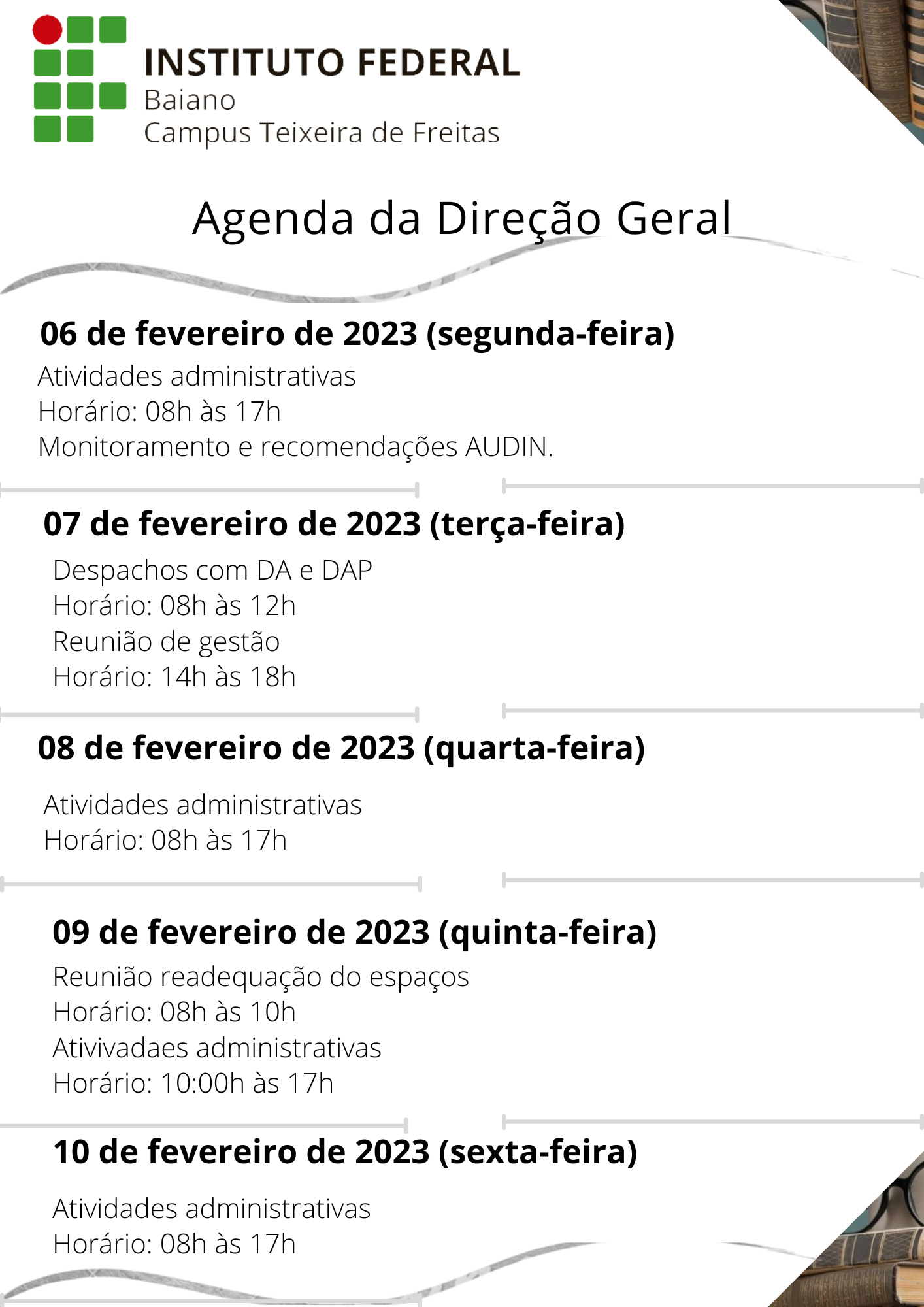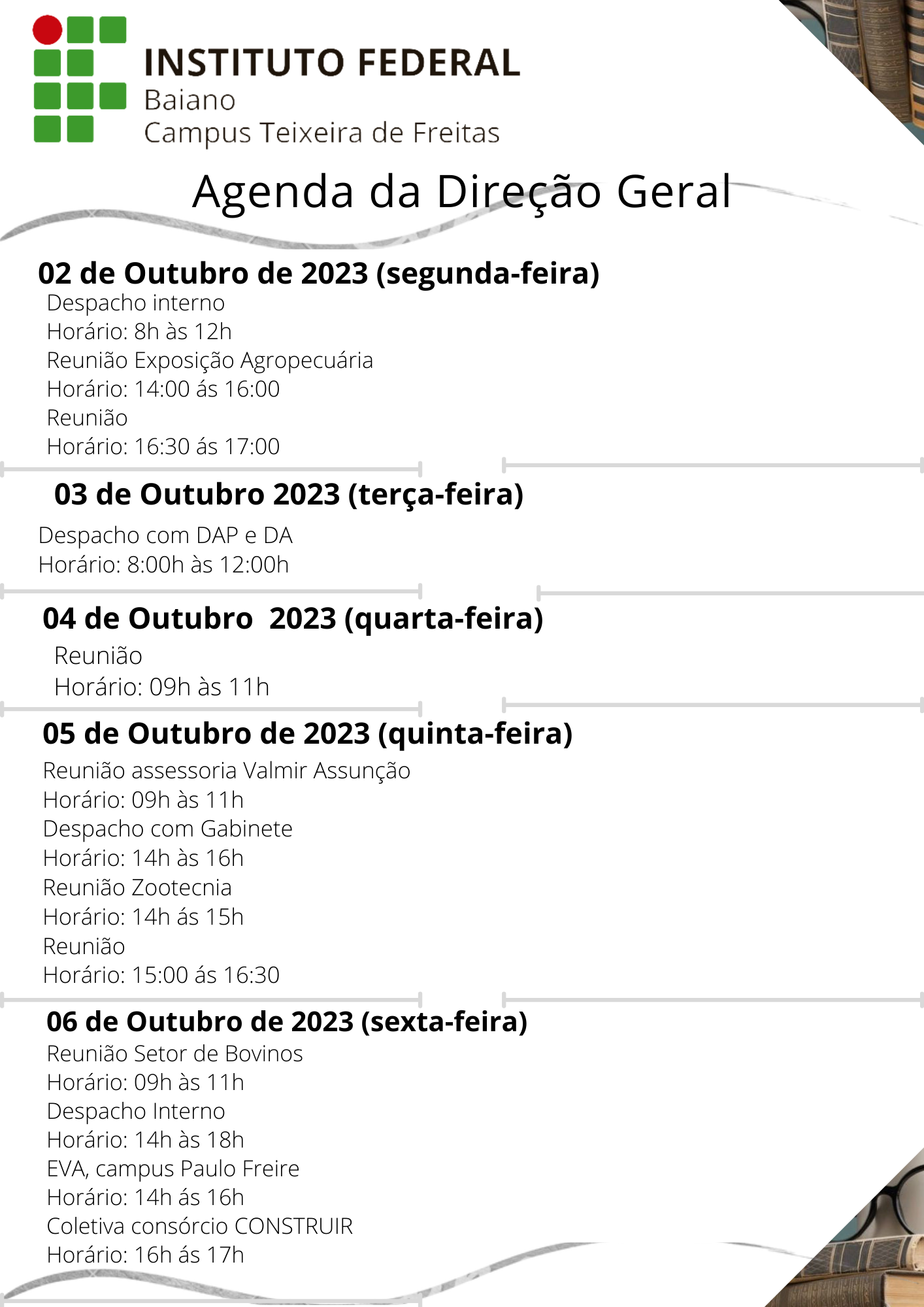 Visualize a Agenda da Direção do Campus Teixeira de Freitas abaixo ou acesse este link.