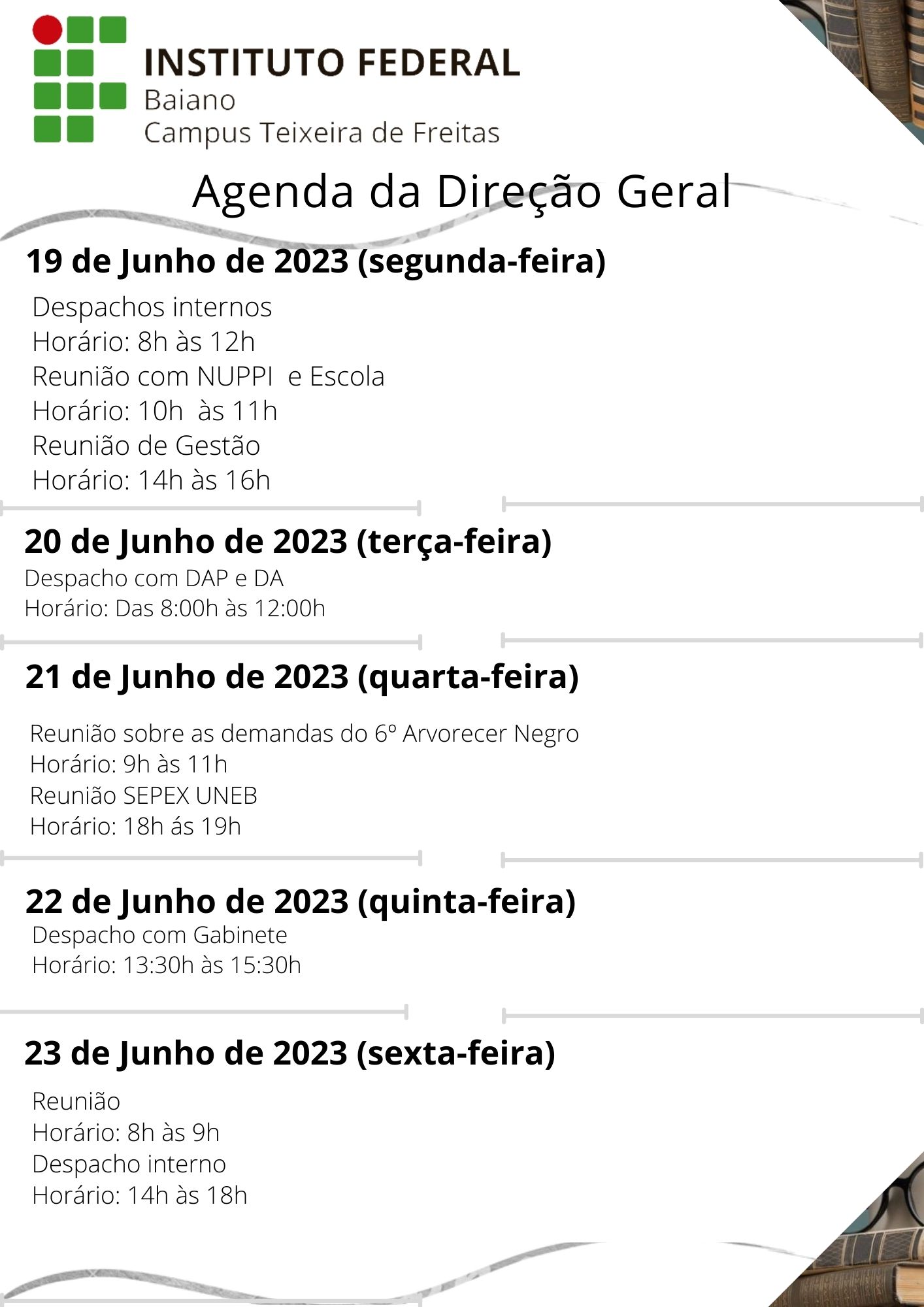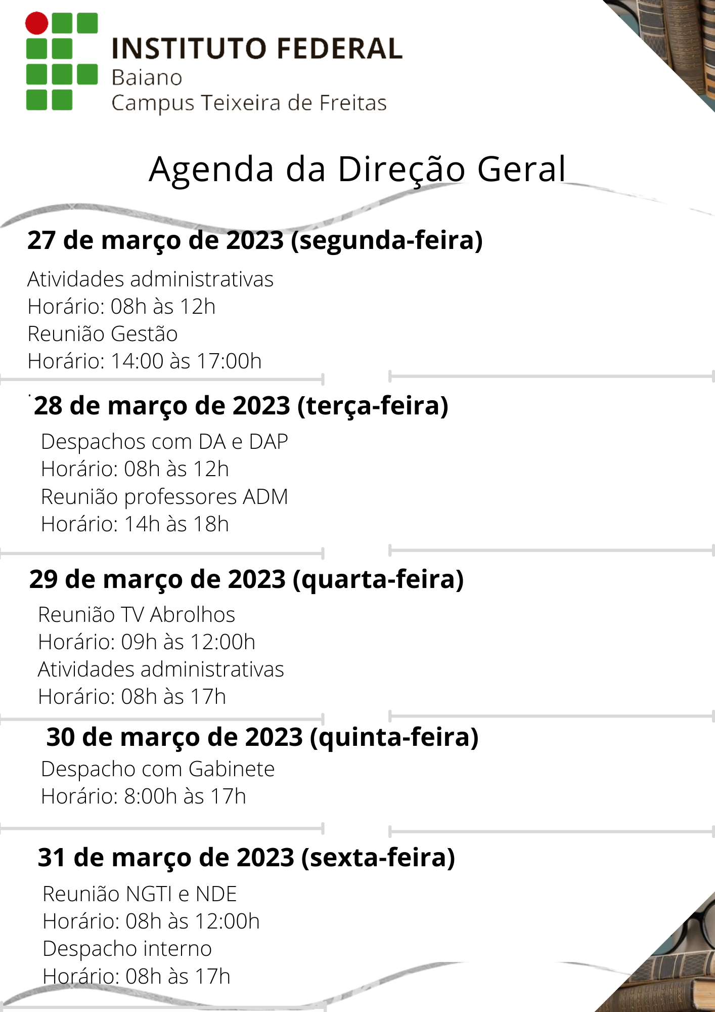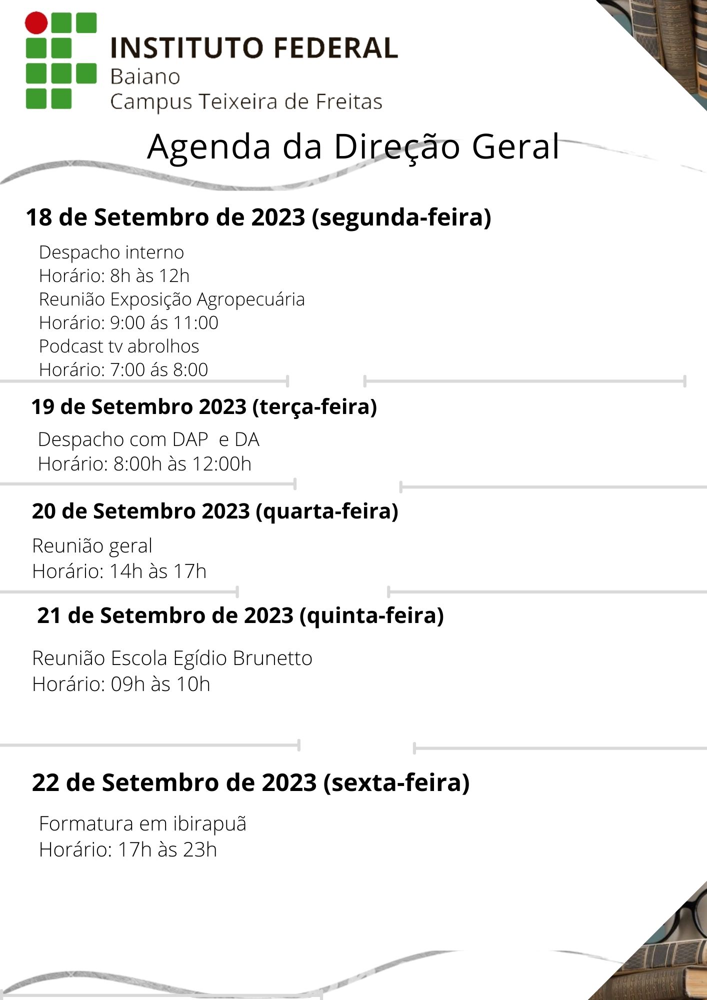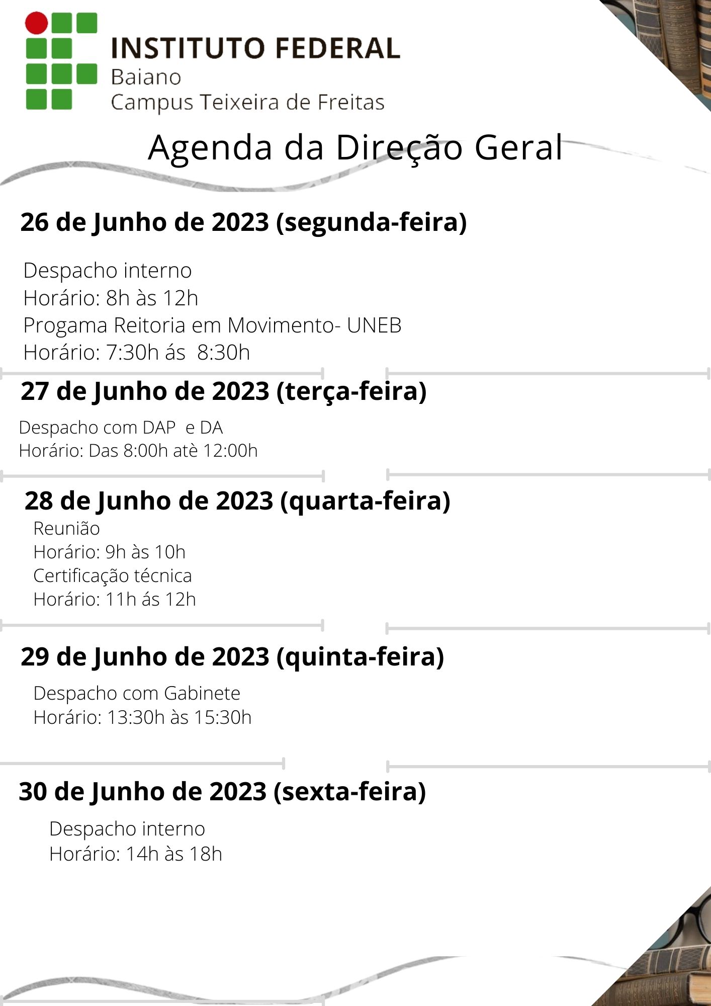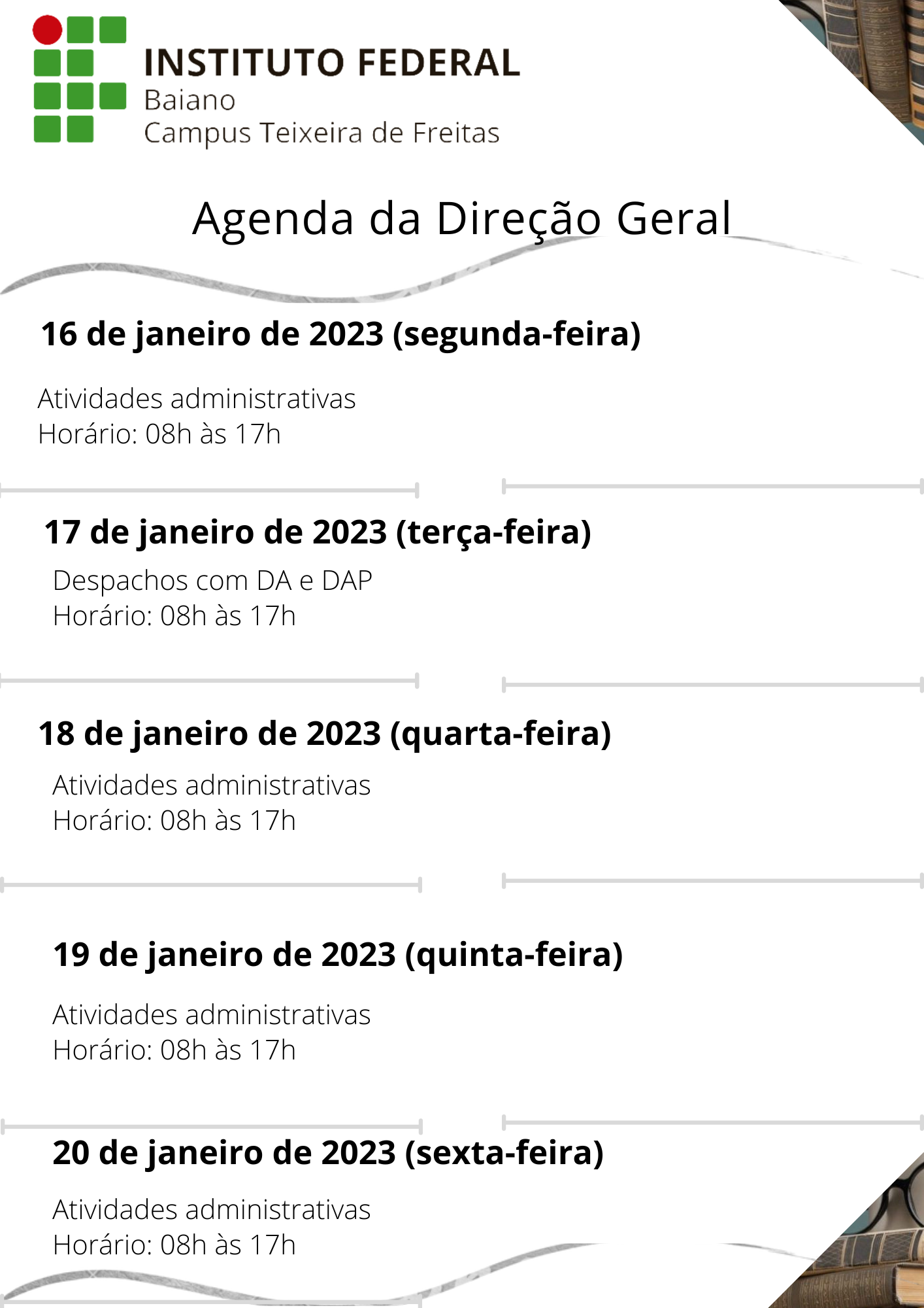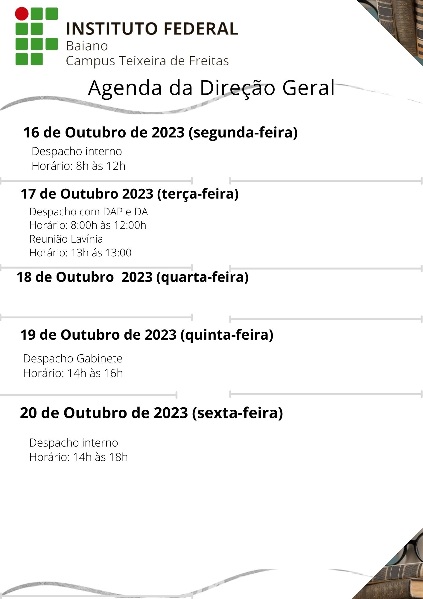 Visualize a Agenda da Direção do Campus Teixeira de Freitas abaixo ou acesse este link.