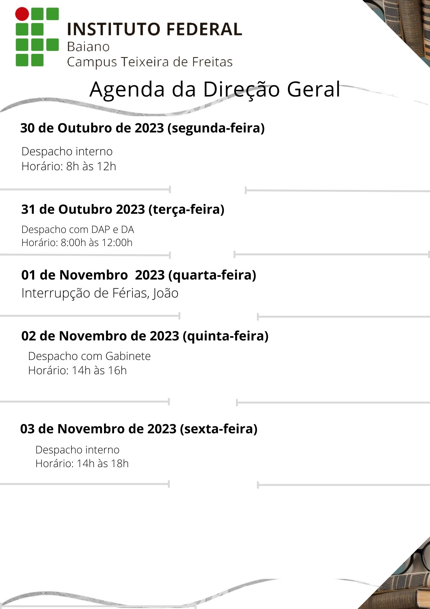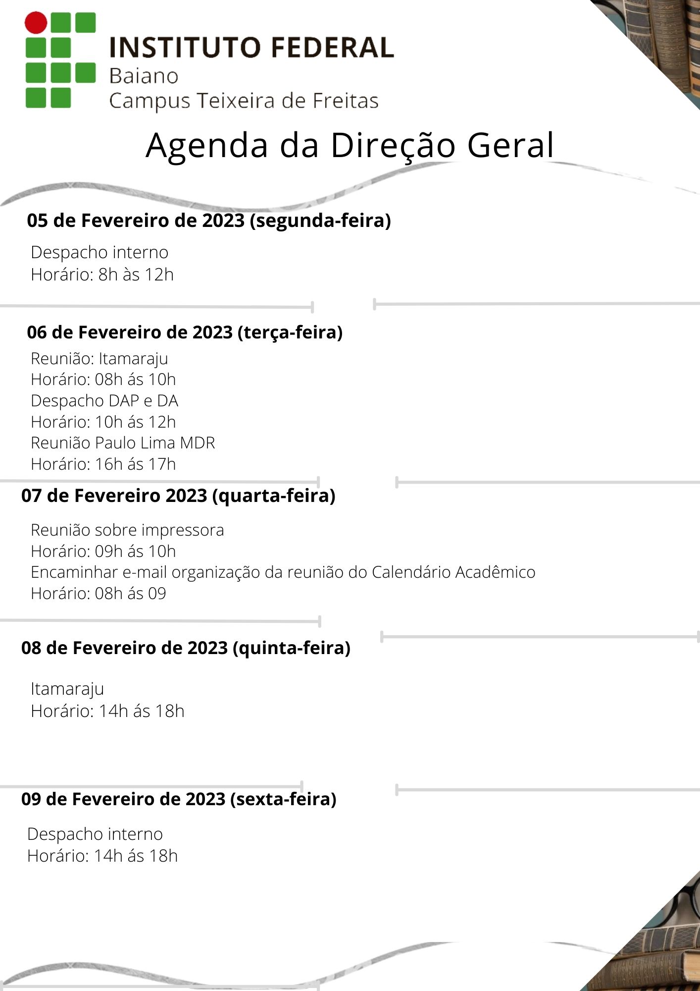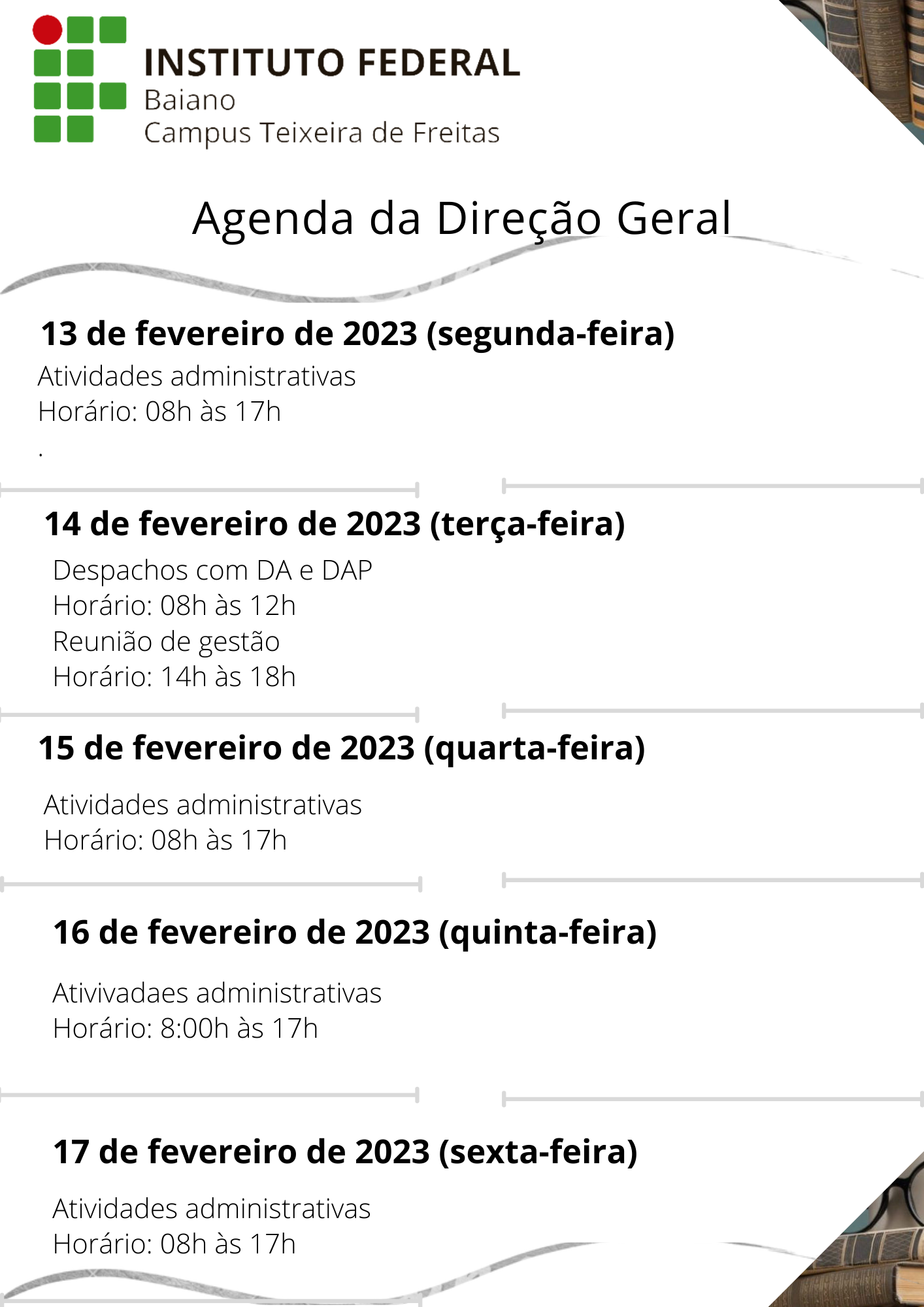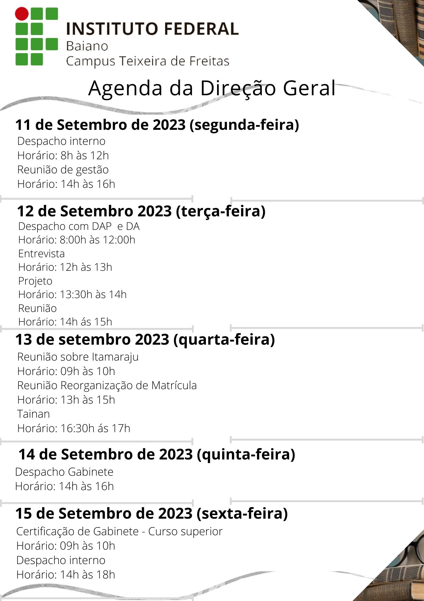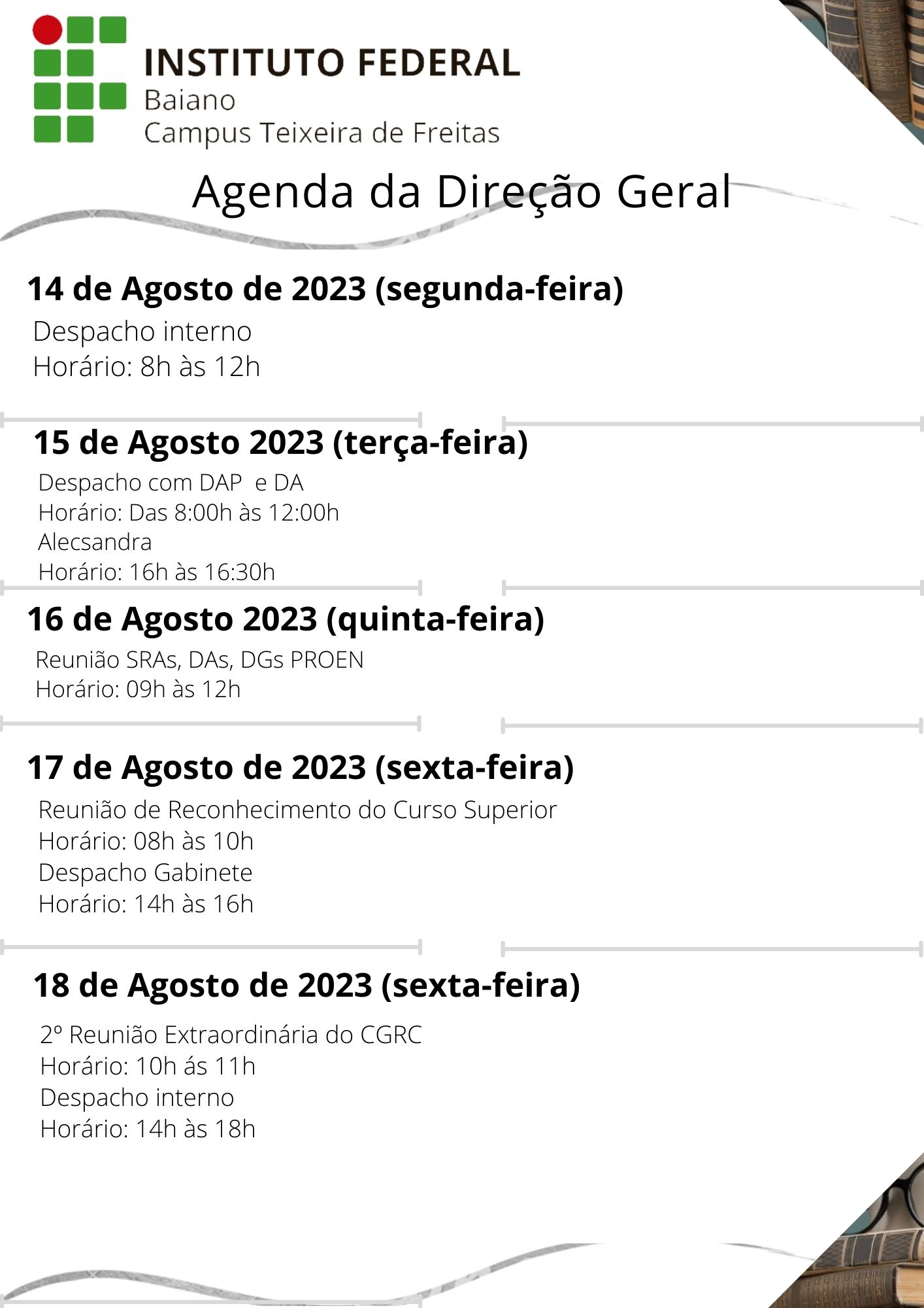 Visualize a Agenda da Direção do Campus Teixeira de Freitas abaixo ou acesse este link.