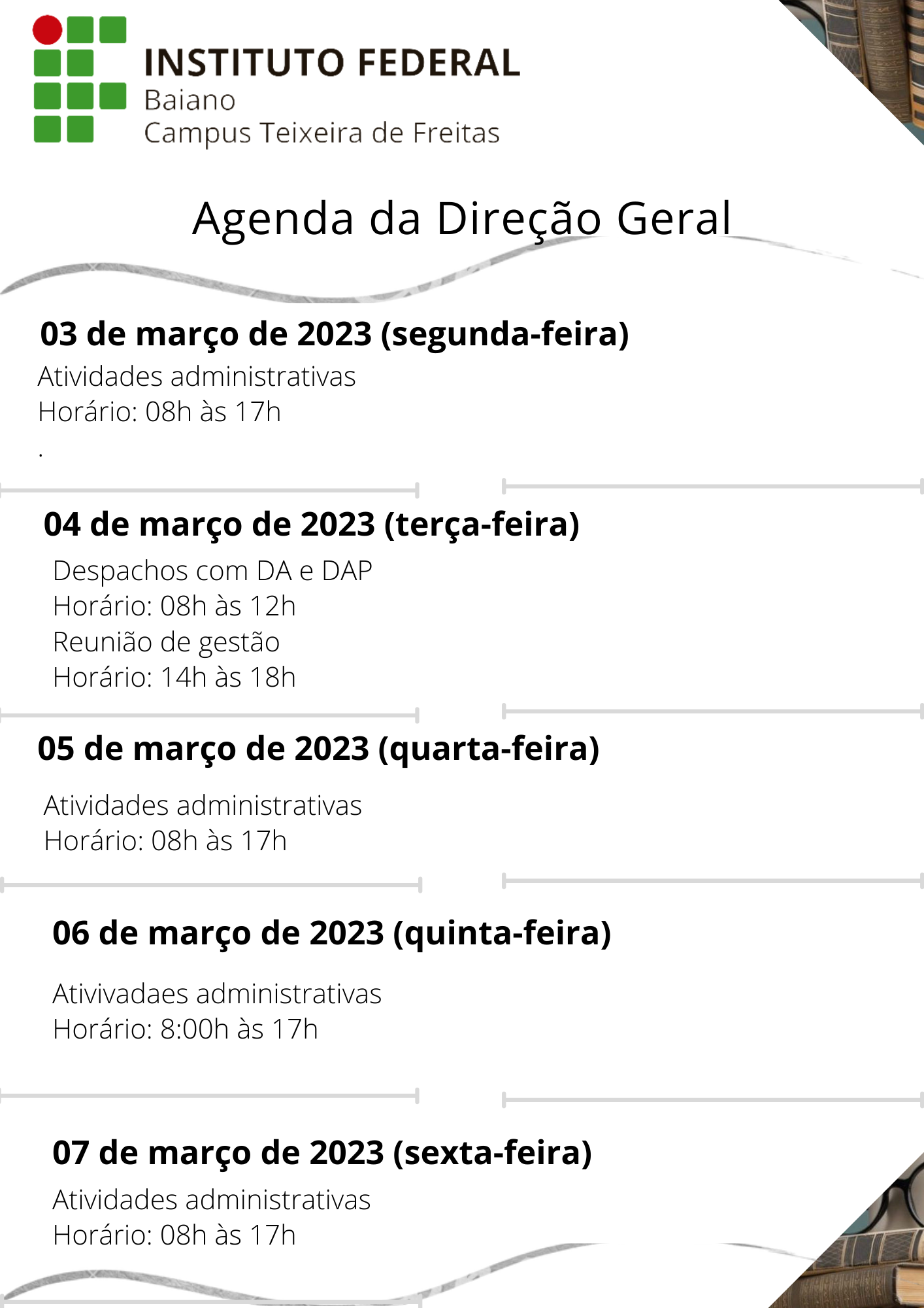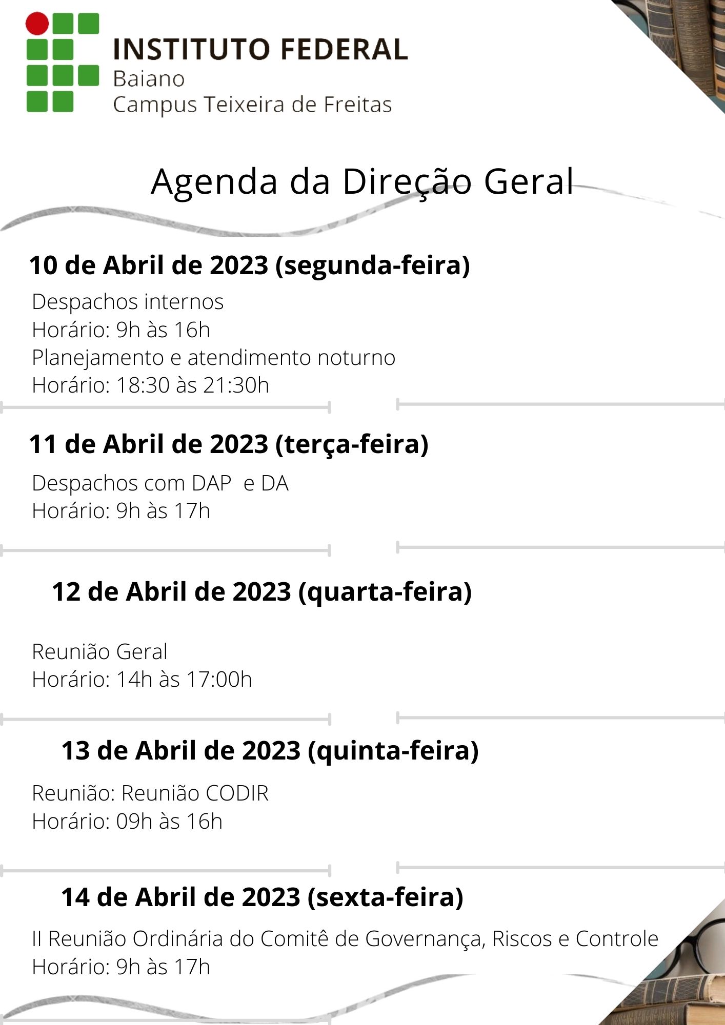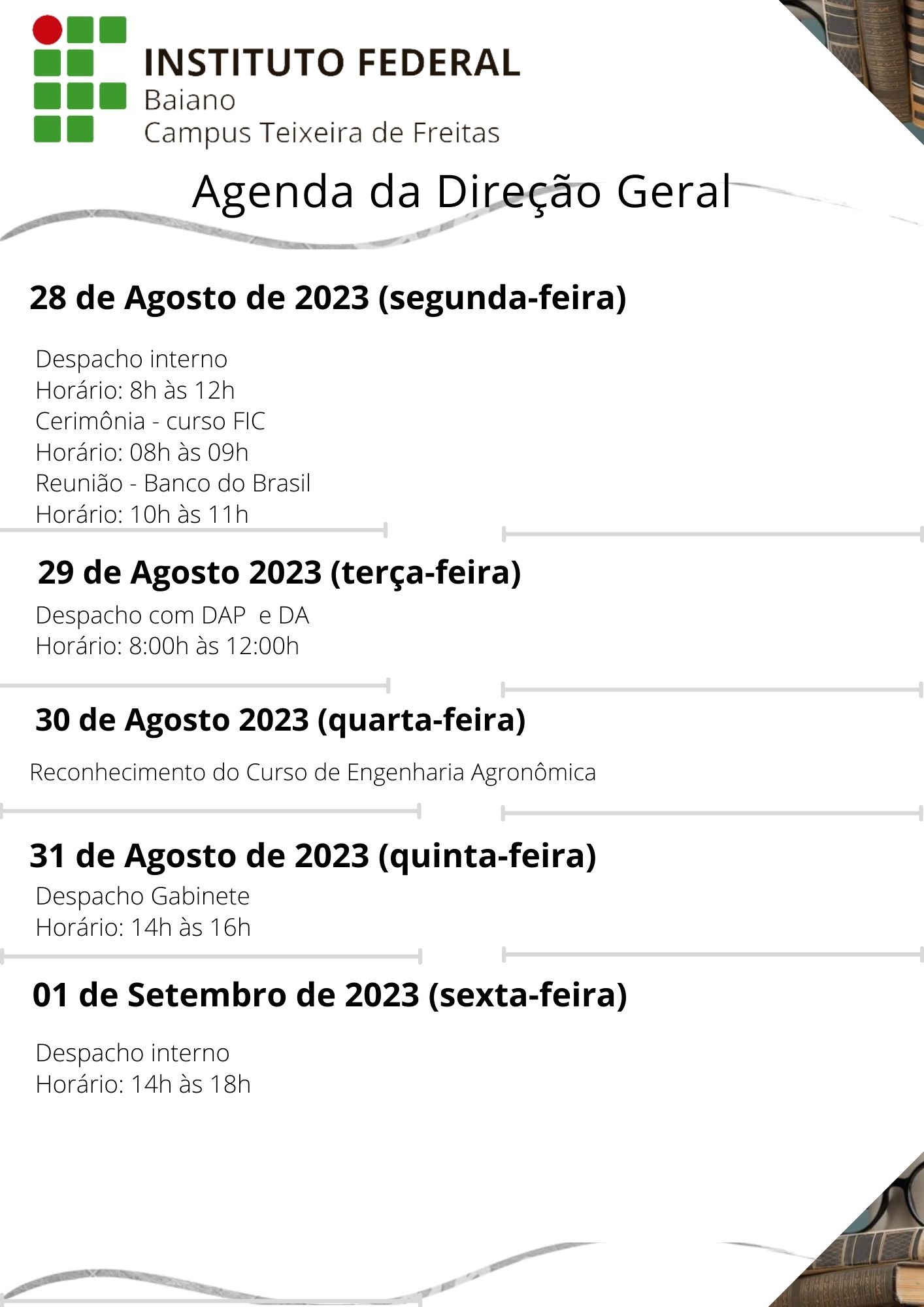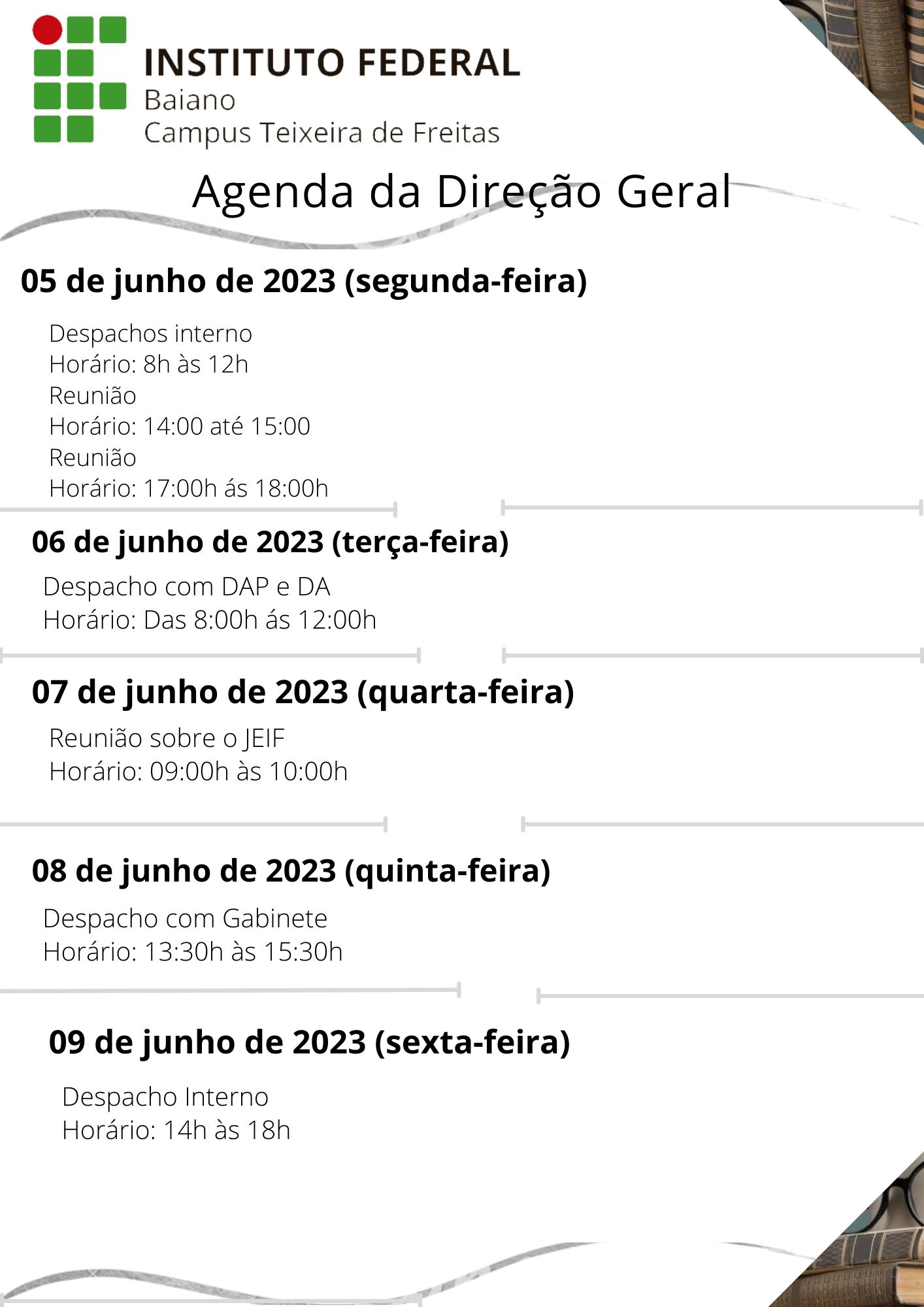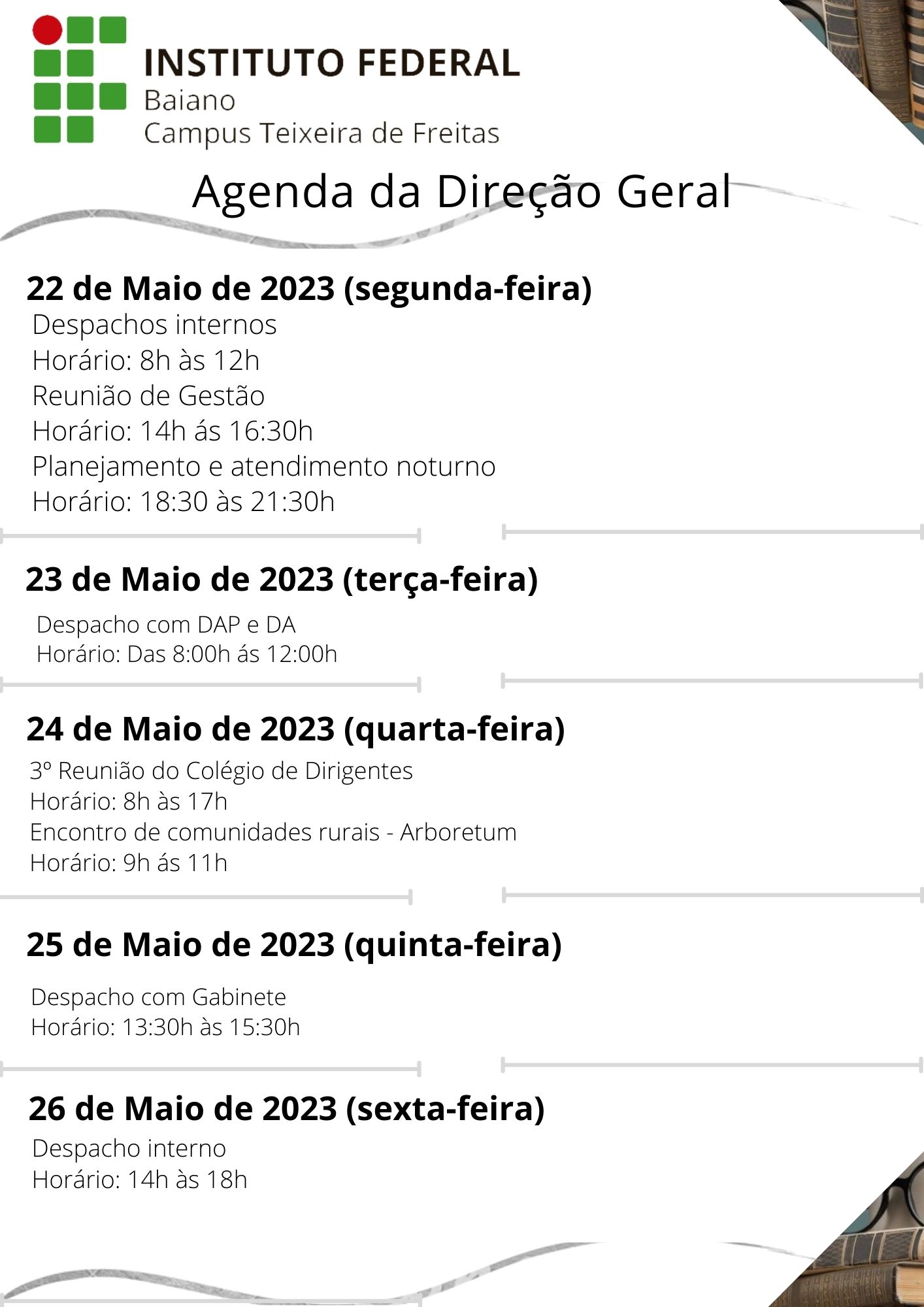 Visualize a Agenda da Direção do Campus Teixeira de Freitas abaixo ou acesse este link.