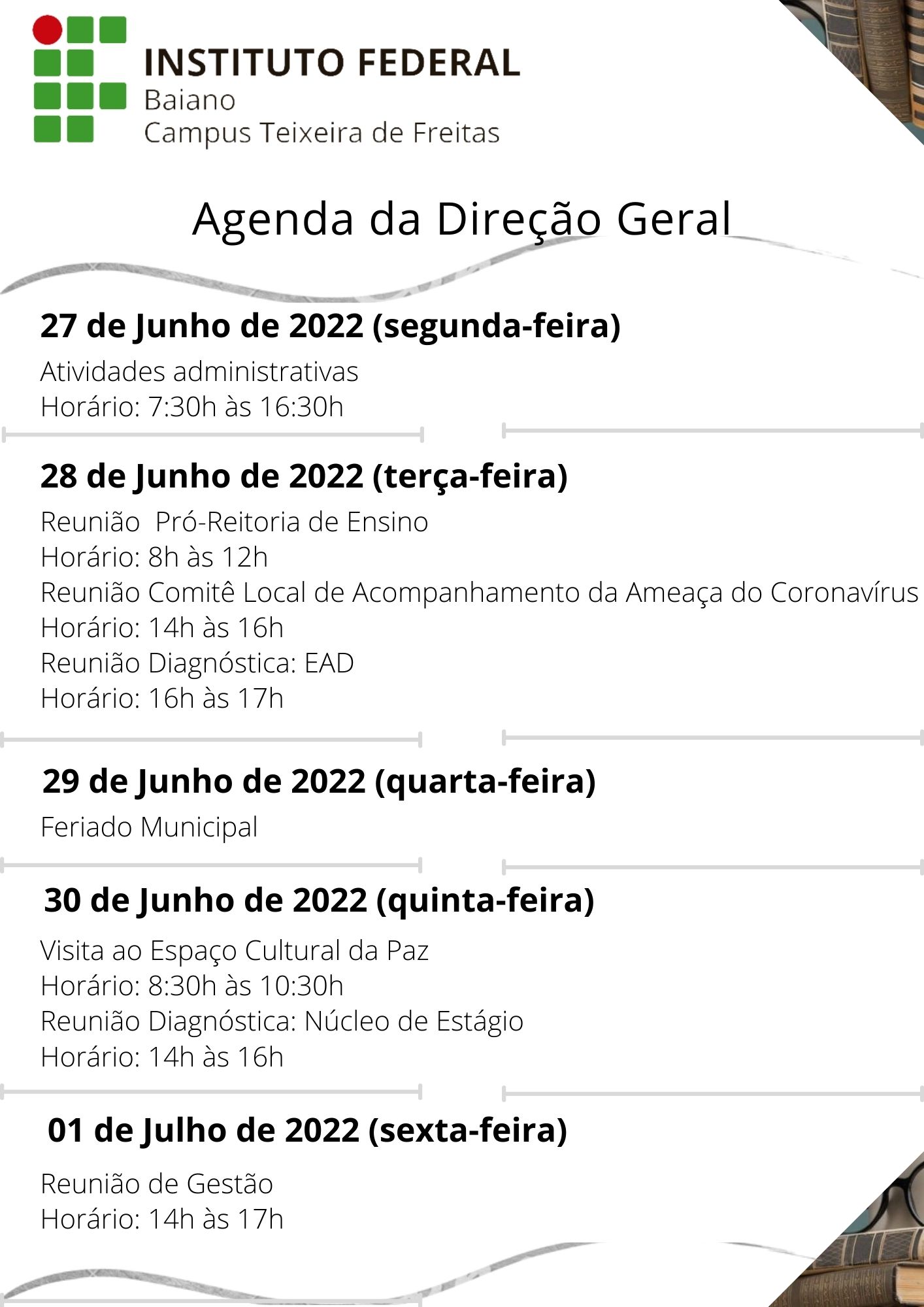 Agenda da Direção Geral – 27 de Junho a 01 de Julho de 2022