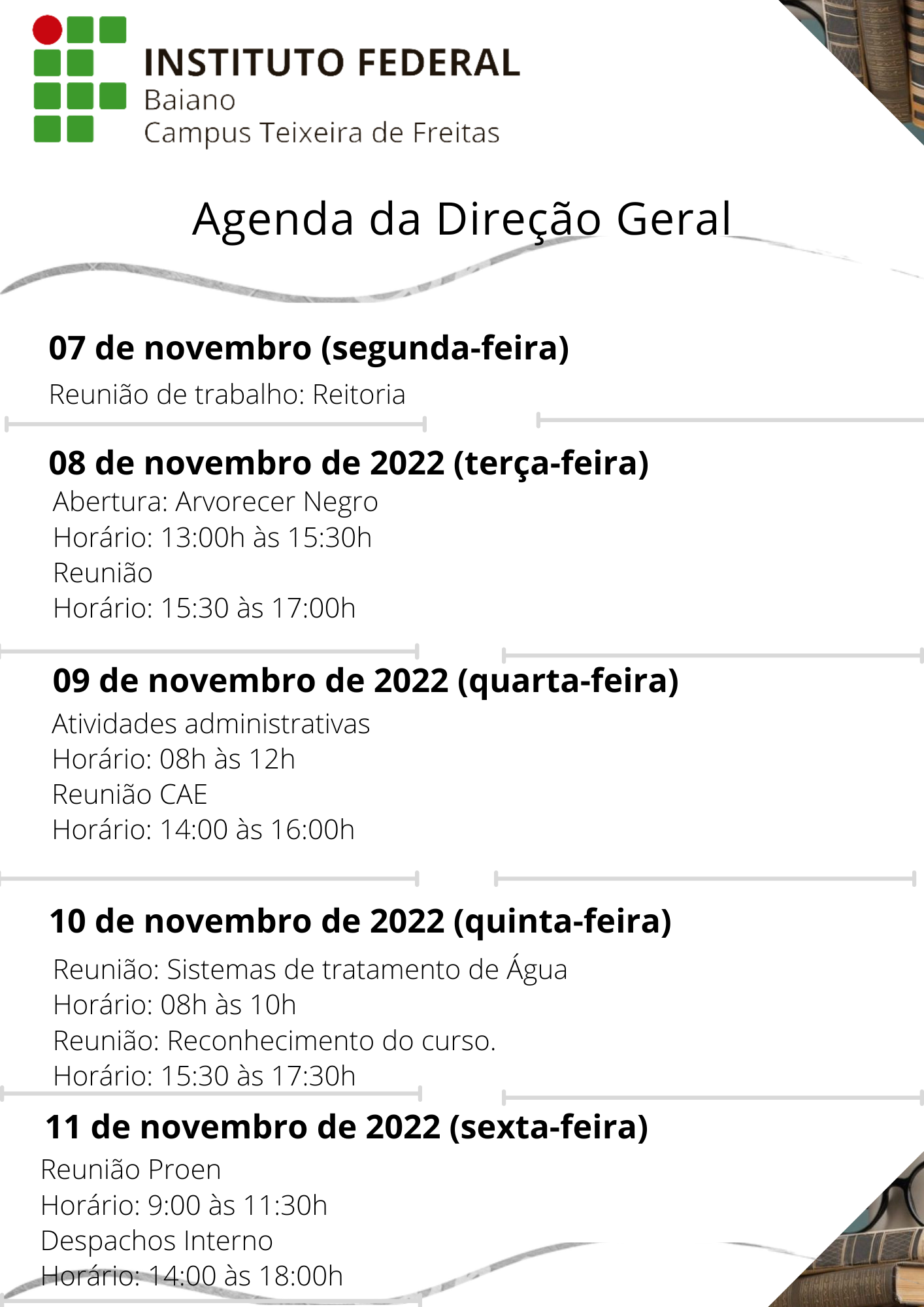 Agenda da Direção Geral de 07 a 11 de Novembro de 2022