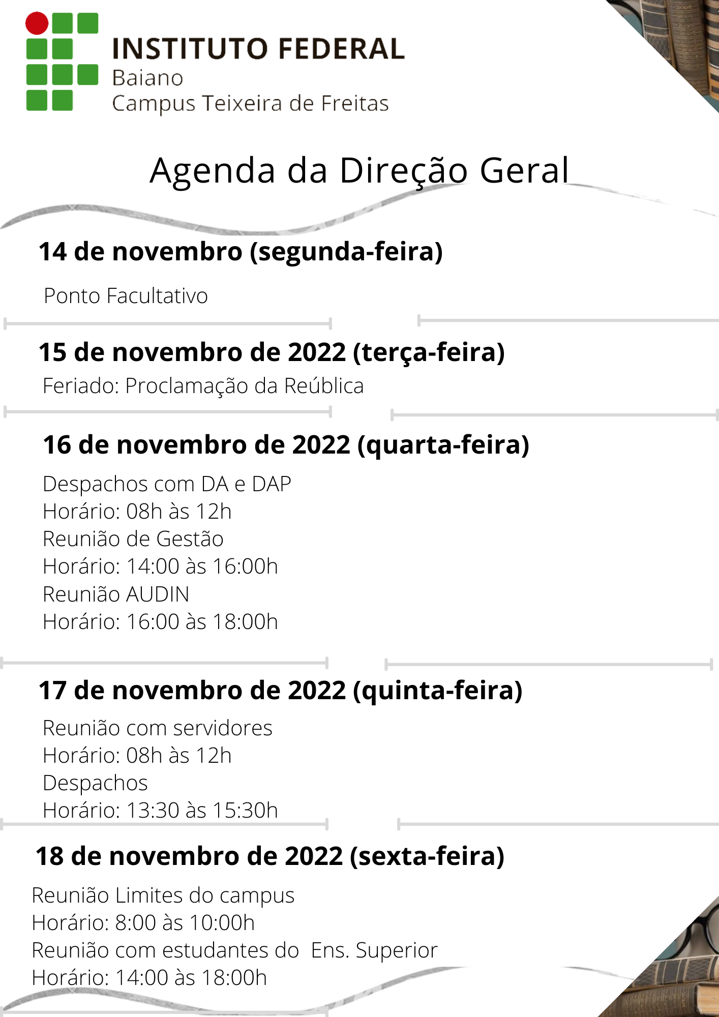Agenda da Direção Geral de 14 a 18 de Novembro de 2022