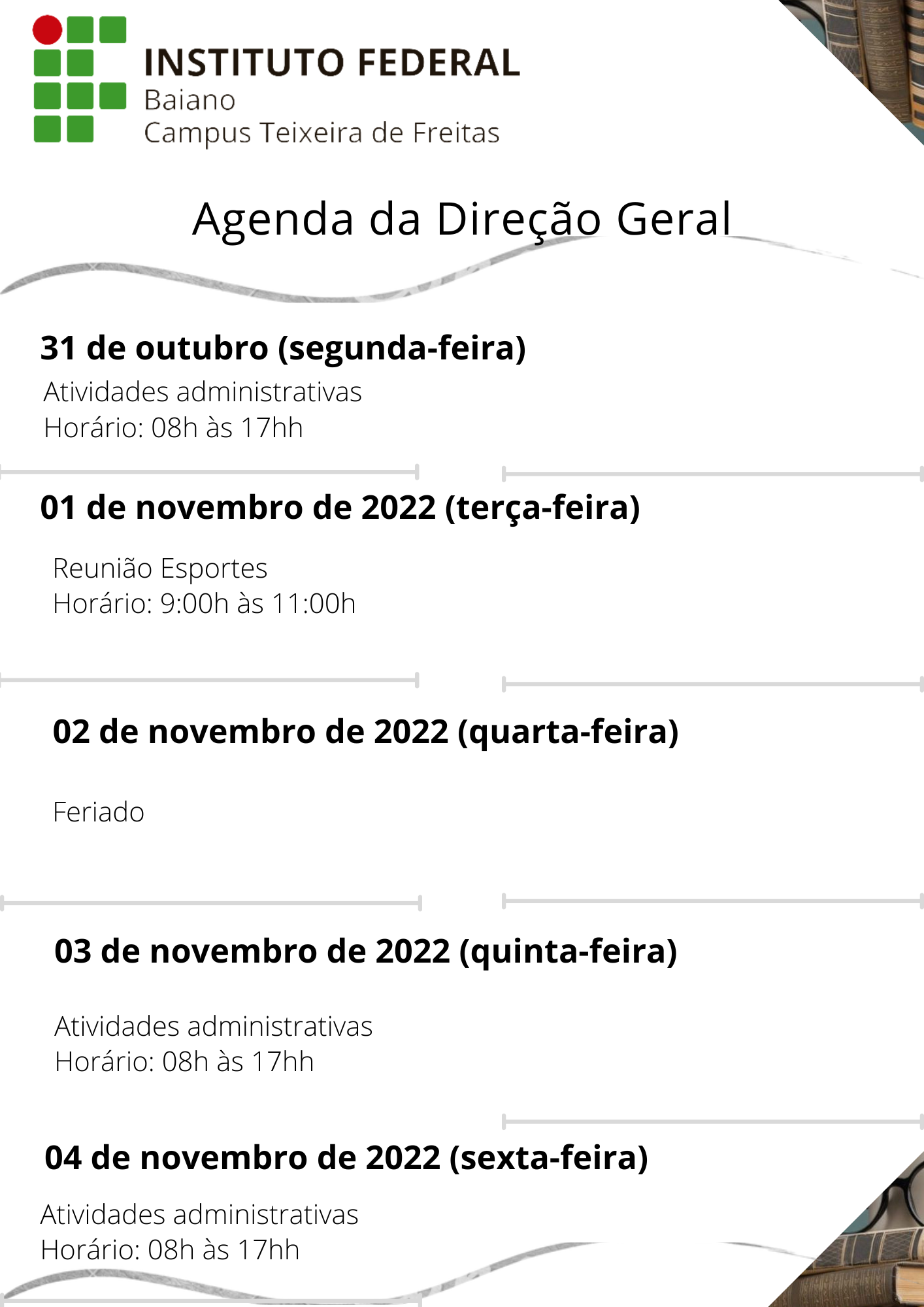 Agenda da Direção Geral de 31 de Outubro a 04 de Novembro de 2022